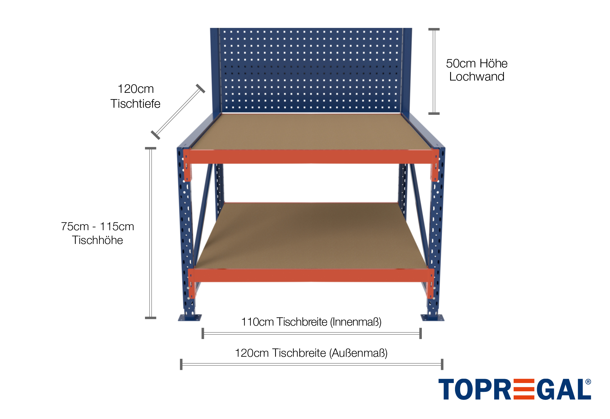 Detta arbetsbord är utrustat med 2 hyllgolv av trä som består av en 25 mm tjock råspånskiva. Tack vare hyllstödets låga vikt är monteringen av arbetsbordet extra lätt. Tack vare den speciella konstruktionen hos våra stegbalkar fäster sig trägolven av sig självt och säkras mot att glida och falla ut. Dessa orangelackerade balkar kan enkelt hakas fast individuellt i ett rutnät på 50 mm med hjälp av instickskonstruktionen. Höjden på hela bordet kan också varieras med upp till 40 cm. Arbetsbordet kan utformas efter dina idéer.