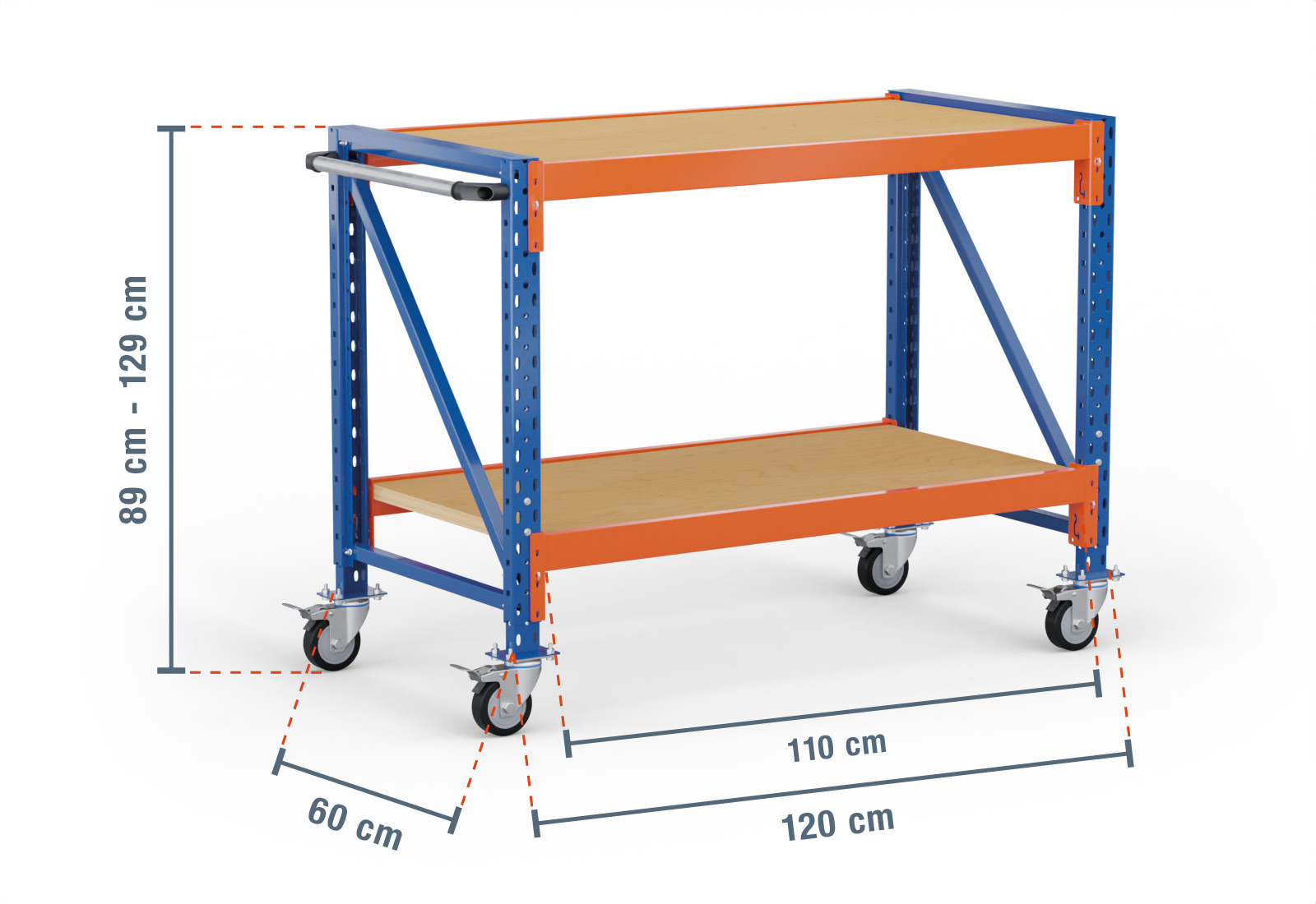 1,2 m arbetsbord mobilt MFW1000-AT / 60 cm djup / 890 - 1.290 mm höjd / 2 nivåer / stöd kryssfanér