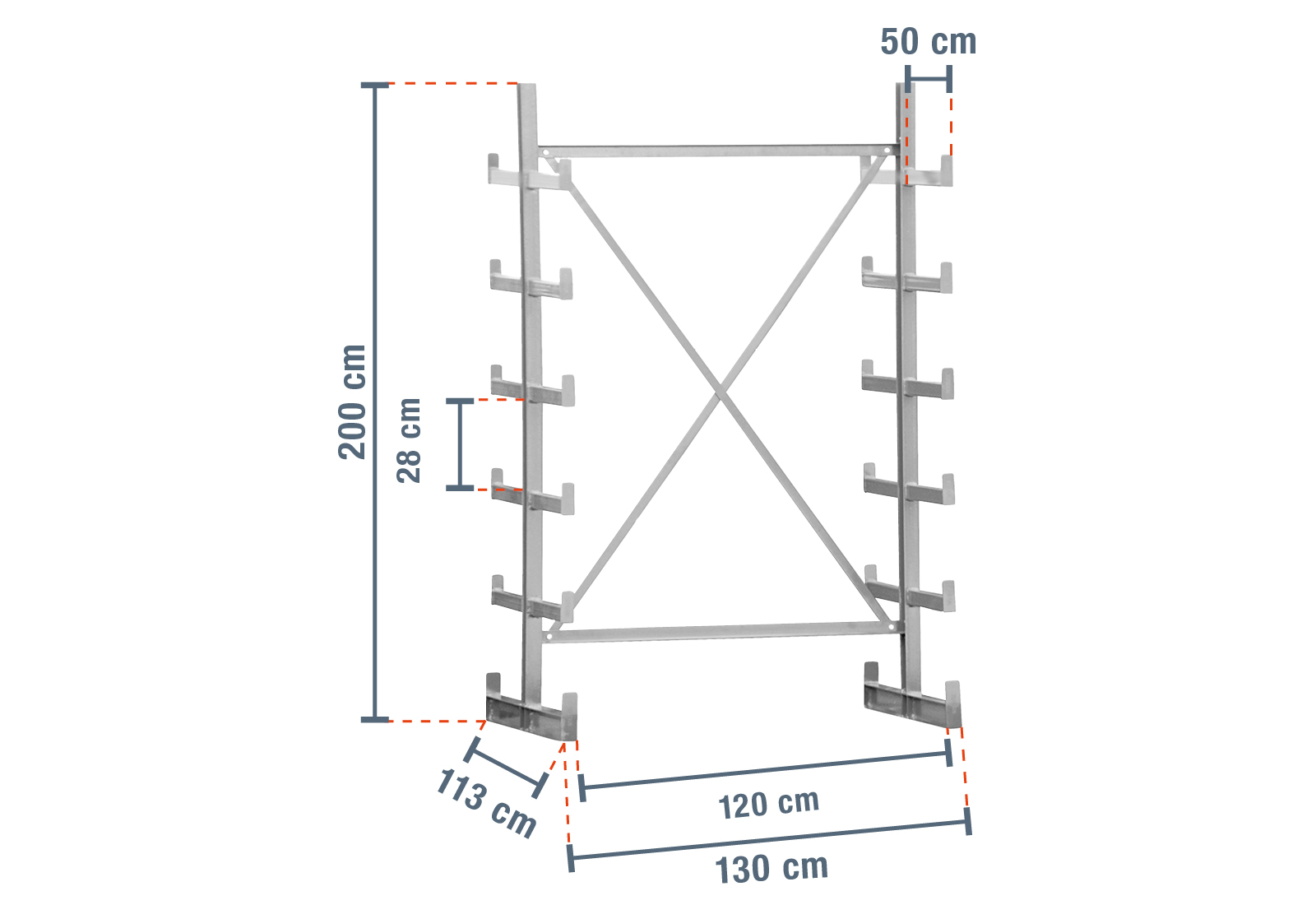 Denna grenställhylla är ytterst robust, har en bredd på 1,3 m, en höjd på 2 m och 5 nivåer med ett armdjup på 50 cm. Tack vare dubbelsidesutförandet med redan fastsvetsade grenställ kan du belasta varje stativ med upp till 2.500 kg, varav varje arm har en maximal belastning på 250 kg.