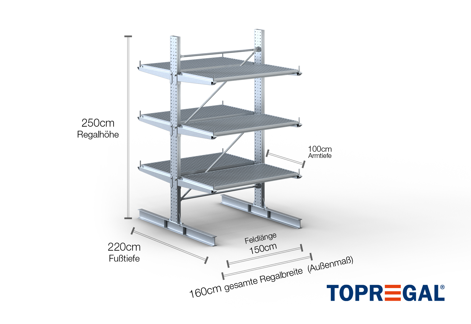 Denna grenställhylla i dubbelsidigt utförande med en bredd på 1,6 m är 2,5 m hög, har ett totalt djup på 220 cm och har 3 grenställnivåer med ett armdjup på 100 cm. Den maximala belastningen per arm är högst 500 kg. Grenställen kan hakas fast individuellt i rutnätsmåttet 50 mm och säkras med låsbultar och -sprintar. Även fotdelarna kan användas (beroende på gods) som lagernivå. För att skydda lasten mot att glida iväg kan ett avrullningsskydd sättas in i änden av varje grenställ. Denna ingår som standard i leveransen.