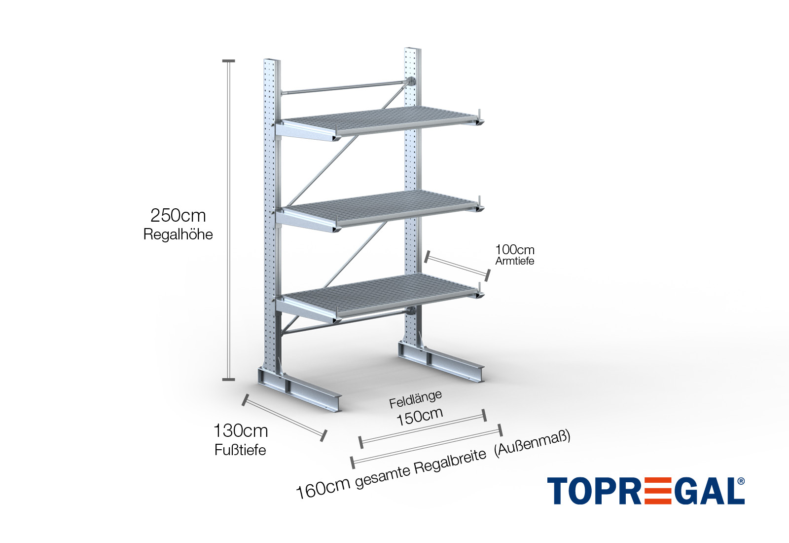 Denna grenställhylla i ensidigt utförande med en bredd på 1,6 m är 2,5 m hög, har ett totalt djup på 130 cm och har 3 grenställnivåer med ett armdjup på 100 cm. Den maximala belastningen per arm är högst 500 kg. Grenställen kan hakas fast individuellt i rutnätsmåttet 50 mm och säkras med låsbultar och -sprintar. Även fotdelarna kan användas (beroende på gods) som lagernivå. För att skydda lasten mot att glida iväg kan ett avrullningsskydd sättas in i änden av varje grenställ. Denna ingår som standard i leveransen.