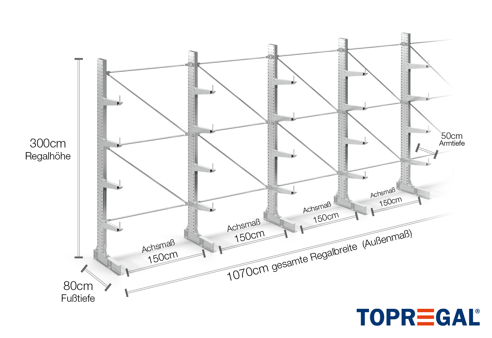 Axelmåttet är det inre måttet mellan två hyllstolpar. Beroende på typen av kragarm erbjuder vi dessa fält i 120 cm (KR2500) och i 100 cm / 150 cm (KR3000 / KR6000).