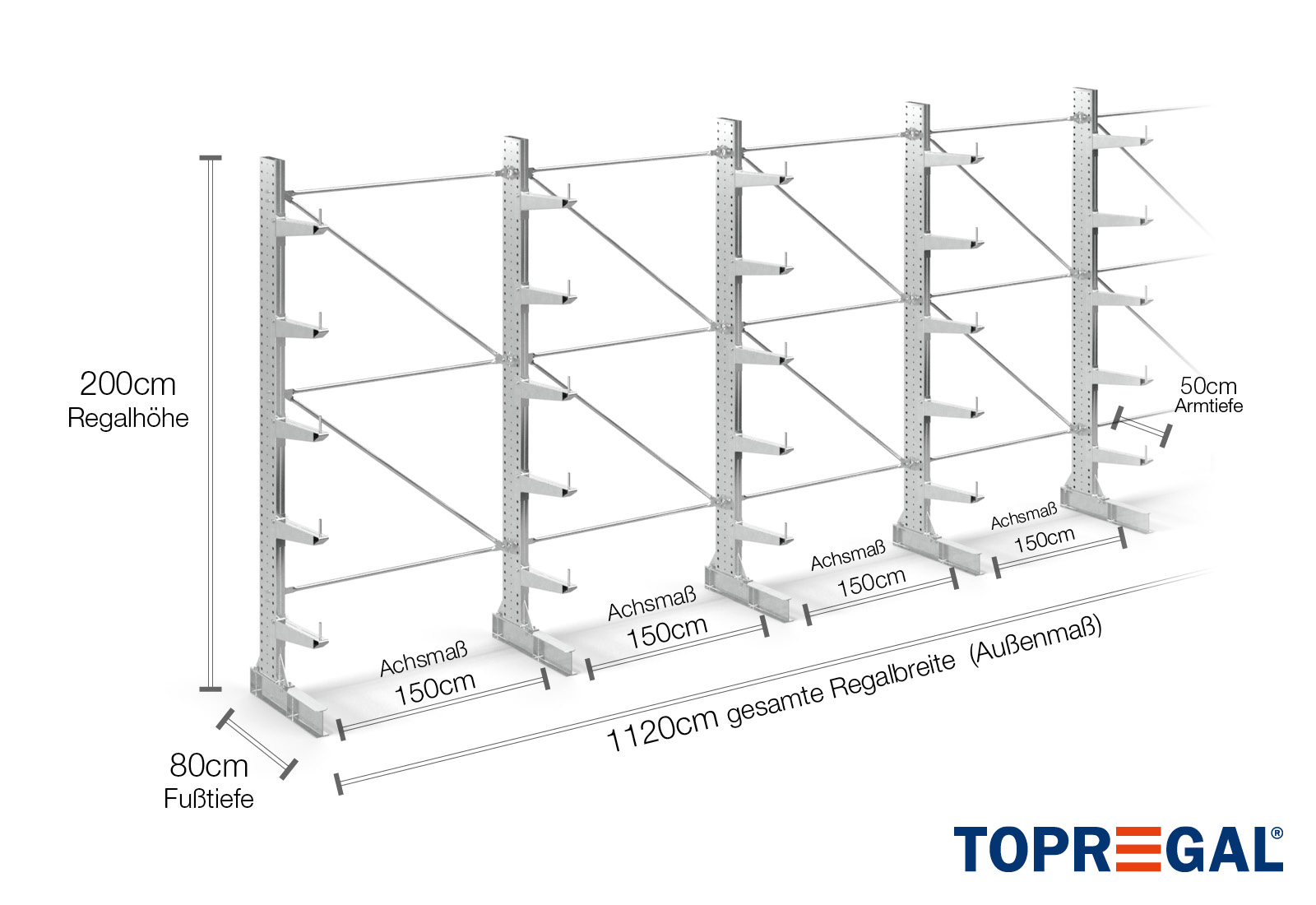 Axelmåttet är det inre måttet mellan två hyllstolpar. Beroende på typen av kragarm erbjuder vi dessa fält i 120 cm (KR2500) och i 100 cm / 150 cm (KR3000 / KR6000).