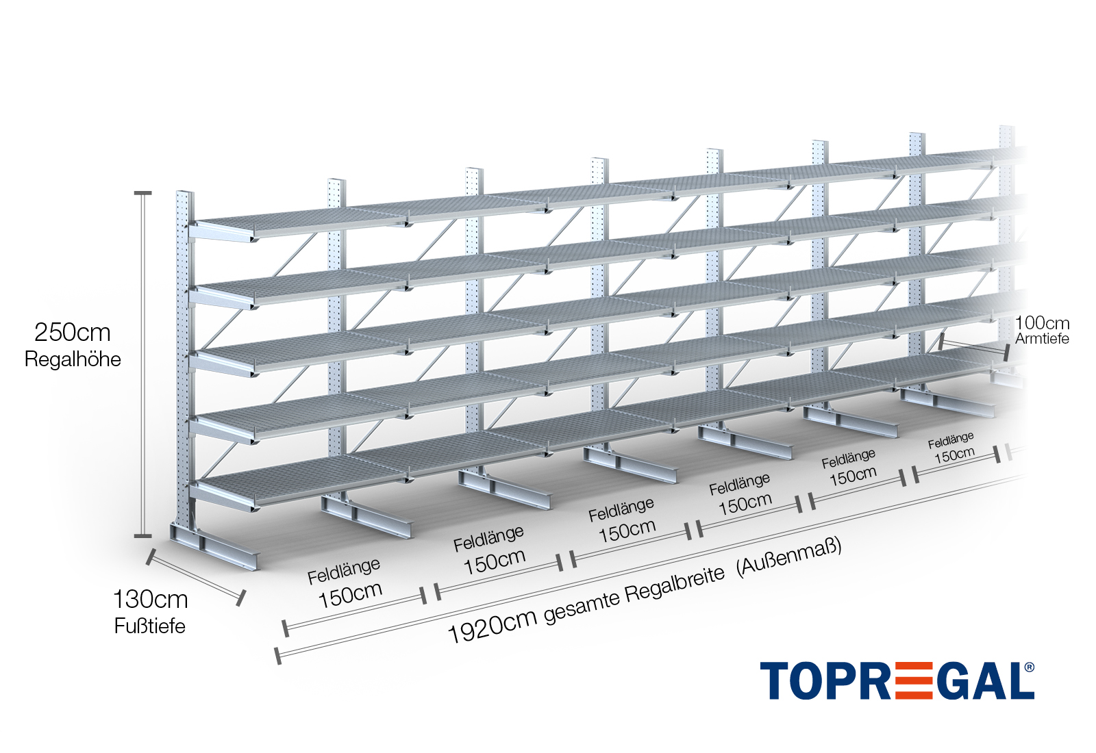 Denna grenställhylla i ensidigt utförande med en bredd på 19,2 m är 2,5 m hög, har ett totalt djup på 130 cm och har 5 grenställnivåer med ett armdjup på 100 cm. Den maximala belastningen per arm är högst 500 kg. Grenställen kan hakas fast individuellt i rutnätsmåttet 50 mm och säkras med låsbultar och -sprintar. Även fotdelarna kan användas (beroende på gods) som lagernivå. För att skydda lasten mot att glida iväg kan ett avrullningsskydd sättas in i änden av varje grenställ. Denna ingår som standard i leveransen.