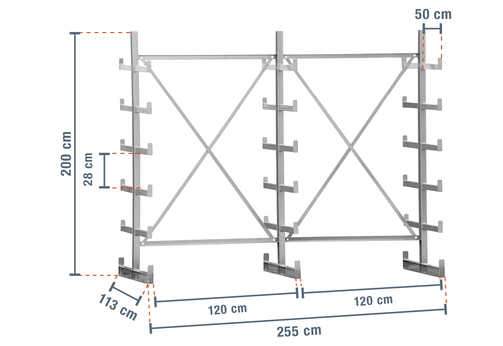 Denna grenställhylla är ytterst robust, har en bredd på 2,55 m, en höjd på 2 m och 5 nivåer med ett armdjup på 50 cm. Tack vare dubbelsidesutförandet med redan fastsvetsade grenställ kan du belasta varje stativ med upp till 2.500 kg, varav varje arm har en maximal belastning på 250 kg.