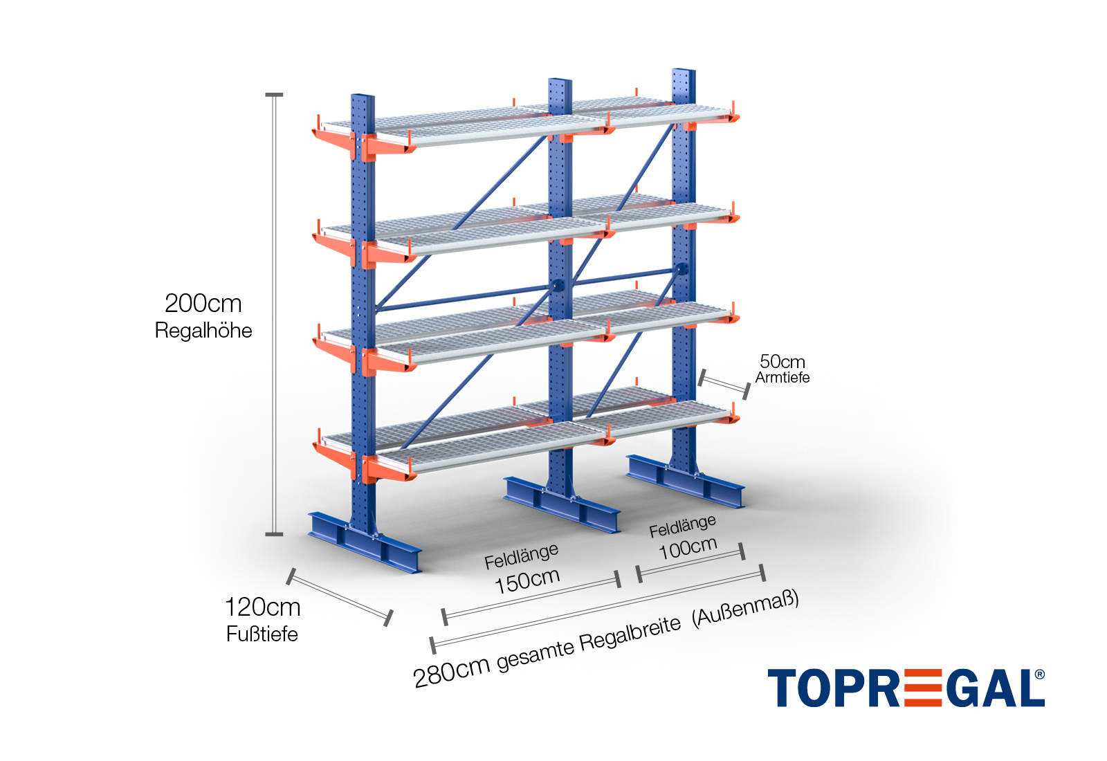 Denna grenställhylla i dubbelsidigt utförande med en bredd på 2,8 m är 2 m hög, har ett totalt djup på 120 cm och har 4 grenställnivåer med ett armdjup på 50 cm. Den maximala belastningen per arm är högst 500 kg. Grenställen kan hakas fast individuellt i rutnätsmåttet 50 mm och säkras med låsbultar och -sprintar. Även fotdelarna kan användas (beroende på gods) som lagernivå. För att skydda lasten mot att glida iväg kan ett avrullningsskydd sättas in i änden av varje grenställ. Denna ingår som standard i leveransen.