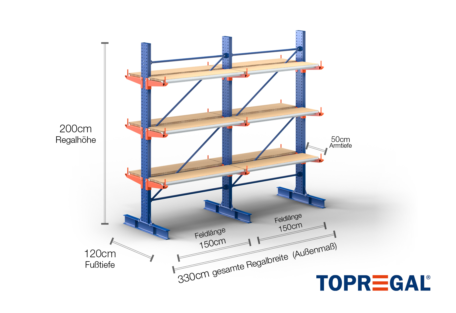 Denna grenställhylla i dubbelsidigt utförande med en bredd på 3,3 m är 2 m hög, har ett totalt djup på 120 cm och har 3 grenställnivåer med ett armdjup på 50 cm. Den maximala belastningen per arm är högst 500 kg. Grenställen kan hakas fast individuellt i rutnätsmåttet 50 mm och säkras med låsbultar och -sprintar. Även fotdelarna kan användas (beroende på gods) som lagernivå. För att skydda lasten mot att glida iväg kan ett avrullningsskydd sättas in i änden av varje grenställ. Denna ingår som standard i leveransen.