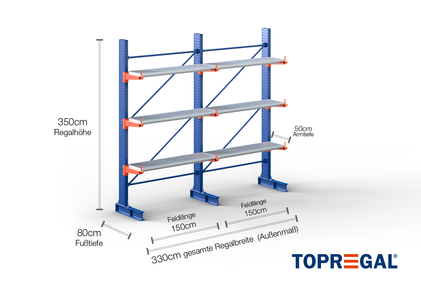 Denna grenställhylla i ensidigt utförande med en bredd på 3,3 m är 3,5 m hög, har ett totalt djup på 80 cm och har 3 grenställnivåer med ett armdjup på 50 cm. Den maximala belastningen per arm är högst 500 kg. Grenställen kan hakas fast individuellt i rutnätsmåttet 50 mm och säkras med låsbultar och -sprintar. Även fotdelarna kan användas (beroende på gods) som lagernivå. För att skydda lasten mot att glida iväg kan ett avrullningsskydd sättas in i änden av varje grenställ. Denna ingår som standard i leveransen.