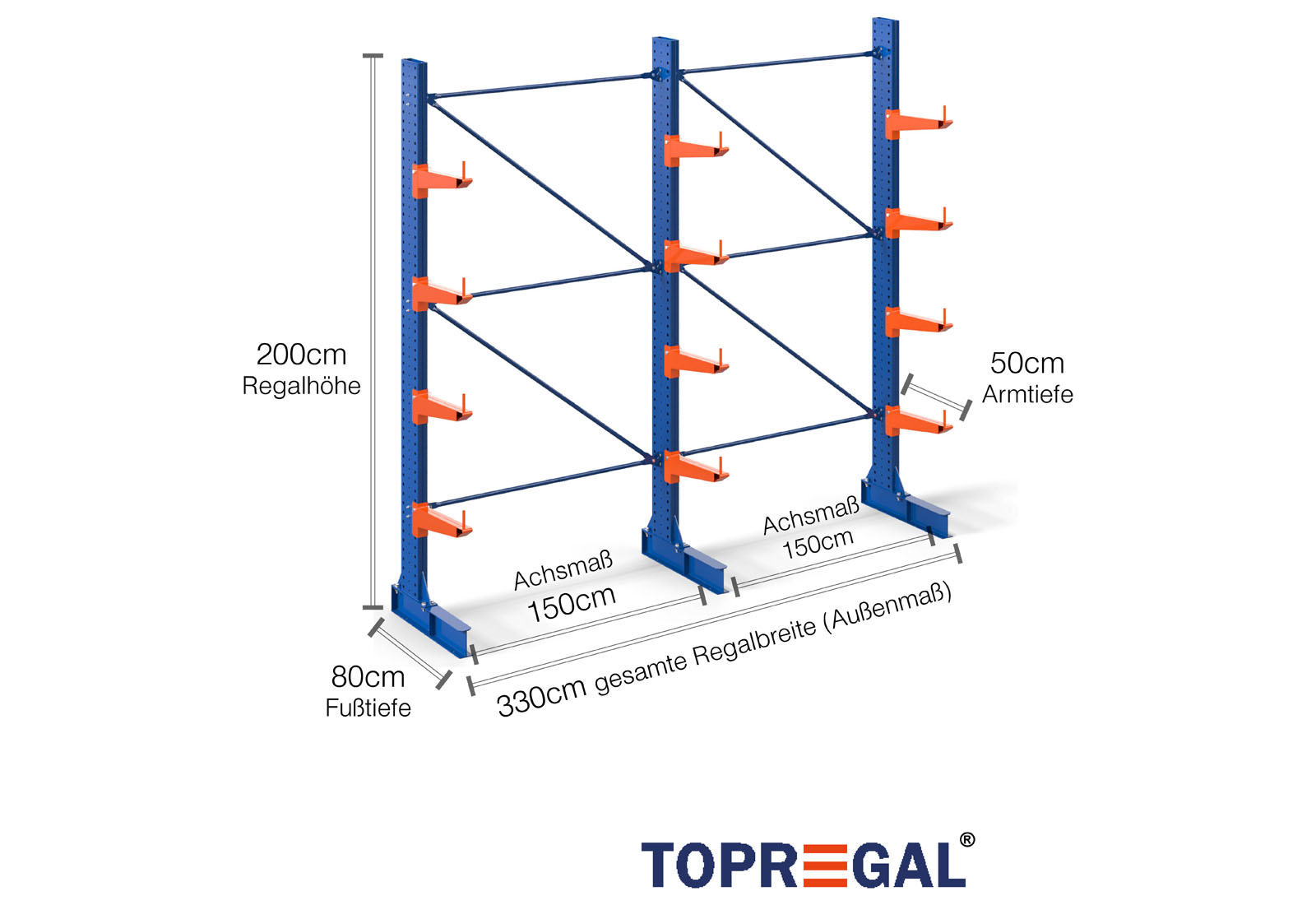 Denna grenställhylla i ensidigt utförande med en bredd på 3,3 m är 2 m hög, har ett totalt djup på 80 cm och har 4 grenställnivåer med ett armdjup på 50 cm. Den maximala belastningen per arm är högst 500 kg. Grenställen kan hakas fast individuellt i rutnätsmåttet 50 mm och säkras med låsbultar och -sprintar. Även fotdelarna kan användas (beroende på gods) som lagernivå. För att skydda lasten mot att glida iväg kan ett avrullningsskydd sättas in i änden av varje grenställ. Denna ingår som standard i leveransen.