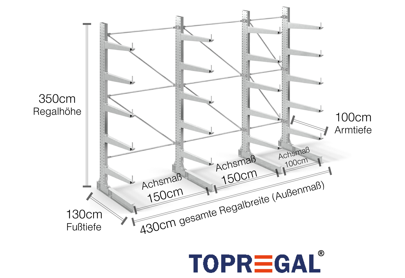 Denna grenställhylla i ensidigt utförande med en bredd på 4,3 m är 3,5 m hög, har ett totalt djup på 130 cm och har 5 grenställnivåer med ett armdjup på 100 cm. Den maximala belastningen per arm är högst 500 kg. Grenställen kan hakas fast individuellt i rutnätsmåttet 50 mm och säkras med låsbultar och -sprintar. Även fotdelarna kan användas (beroende på gods) som lagernivå. För att skydda lasten mot att glida iväg kan ett avrullningsskydd sättas in i änden av varje grenställ. Denna ingår som standard i leveransen.