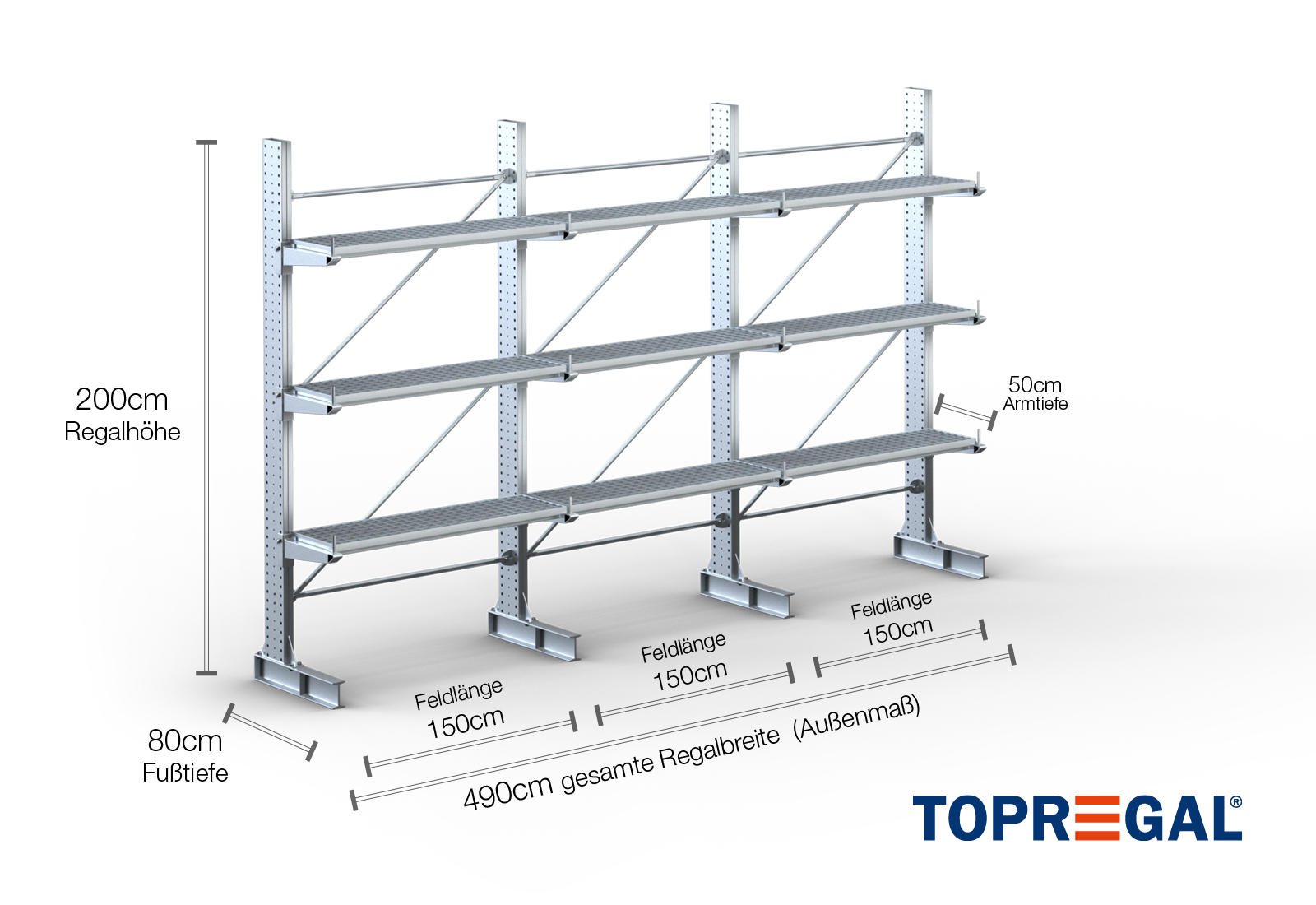 Denna grenställhylla i ensidigt utförande med en bredd på 4,9 m är 2 m hög, har ett totalt djup på 80 cm och har 3 grenställnivåer med ett armdjup på 50 cm. Den maximala belastningen per arm är högst 500 kg. Grenställen kan hakas fast individuellt i rutnätsmåttet 50 mm och säkras med låsbultar och -sprintar. Även fotdelarna kan användas (beroende på gods) som lagernivå. För att skydda lasten mot att glida iväg kan ett avrullningsskydd sättas in i änden av varje grenställ. Denna ingår som standard i leveransen.