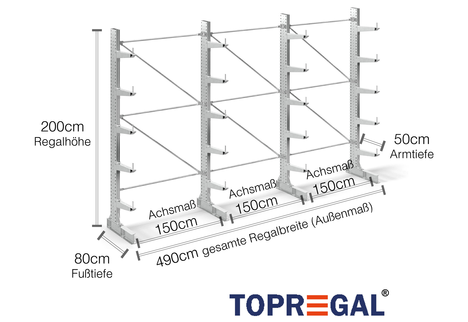Axelmåttet är det inre måttet mellan två hyllstolpar. Beroende på typen av kragarm erbjuder vi dessa fält i 120 cm (KR2500) och i 100 cm / 150 cm (KR3000 / KR6000).