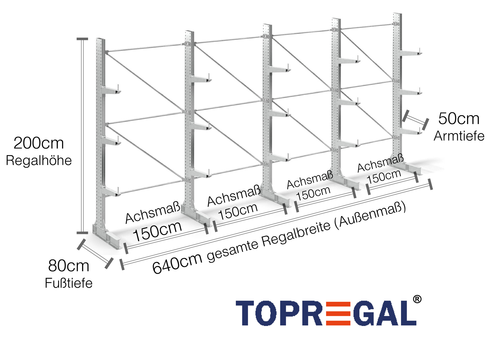 Denna grenställhylla i ensidigt utförande med en bredd på 6,4 m är 2 m hög, har ett totalt djup på 80 cm och har 3 grenställnivåer med ett armdjup på 50 cm. Den maximala belastningen per arm är högst 500 kg. Grenställen kan hakas fast individuellt i rutnätsmåttet 50 mm och säkras med låsbultar och -sprintar. Även fotdelarna kan användas (beroende på gods) som lagernivå. För att skydda lasten mot att glida iväg kan ett avrullningsskydd sättas in i änden av varje grenställ. Denna ingår som standard i leveransen.