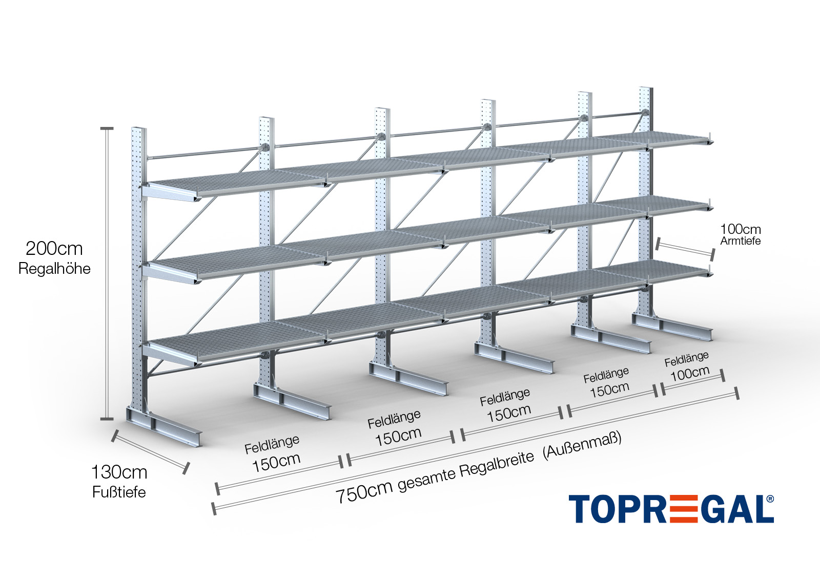 Denna grenställhylla i ensidigt utförande med en bredd på 7,5 m är 2 m hög, har ett totalt djup på 130 cm och har 3 grenställnivåer med ett armdjup på 100 cm. Den maximala belastningen per arm är högst 500 kg. Grenställen kan hakas fast individuellt i rutnätsmåttet 50 mm och säkras med låsbultar och -sprintar. Även fotdelarna kan användas (beroende på gods) som lagernivå. För att skydda lasten mot att glida iväg kan ett avrullningsskydd sättas in i änden av varje grenställ. Denna ingår som standard i leveransen.