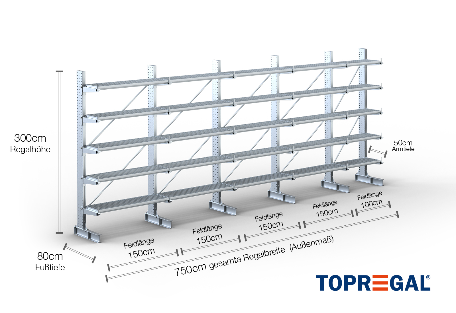 Denna grenställhylla i ensidigt utförande med en bredd på 7,5 m är 3 m hög, har ett totalt djup på 80 cm och har 5 grenställnivåer med ett armdjup på 50 cm. Den maximala belastningen per arm är högst 500 kg. Grenställen kan hakas fast individuellt i rutnätsmåttet 50 mm och säkras med låsbultar och -sprintar. Även fotdelarna kan användas (beroende på gods) som lagernivå. För att skydda lasten mot att glida iväg kan ett avrullningsskydd sättas in i änden av varje grenställ. Denna ingår som standard i leveransen.