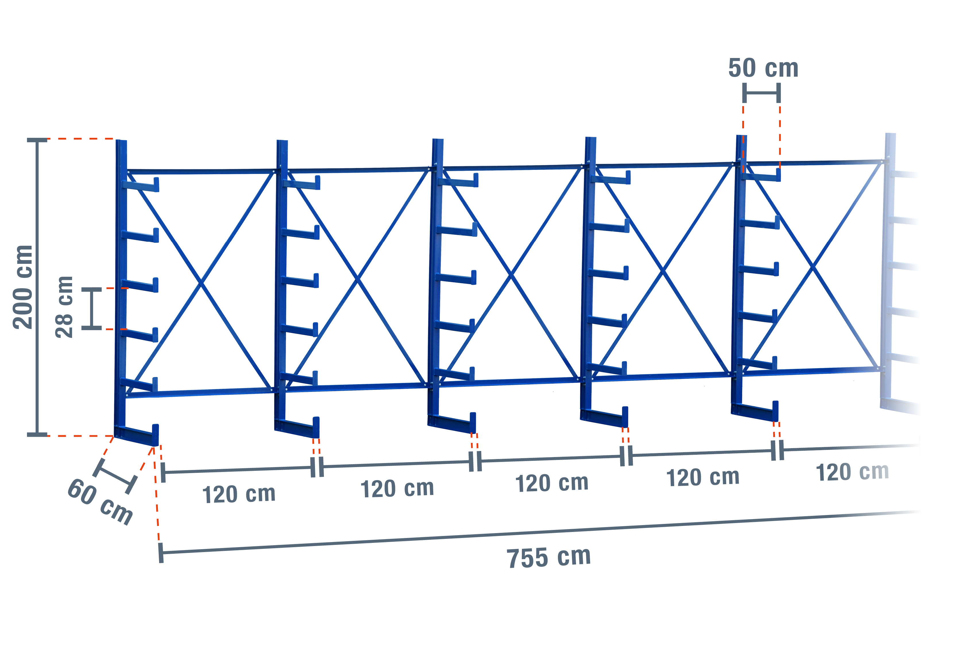 Denna grenställhylla är ytterst robust, har en bredd på 7,55 m, en höjd på 2 m och 5 nivåer med ett armdjup på 50 cm. Tack vare ensidesutförandet med redan fastsvetsade grenställ kan du belasta varje stativ med upp till 1.250 kg, varav varje arm har en maximal belastning på 250 kg.