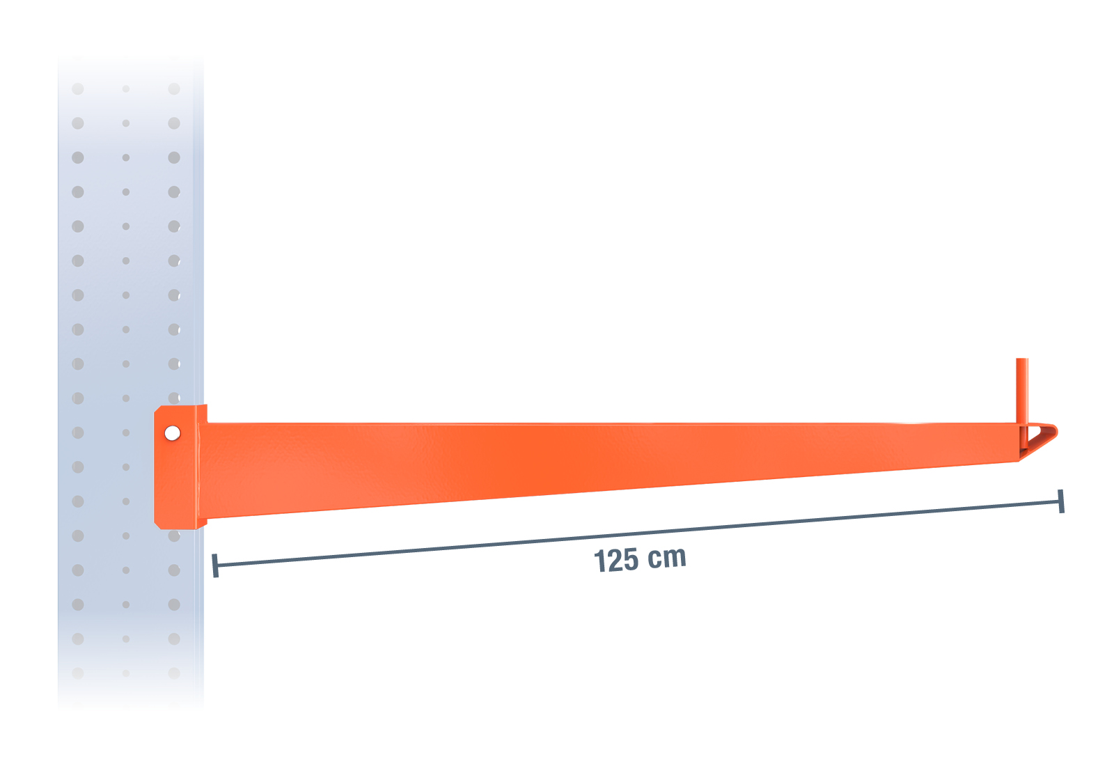 Denna arm är pulverlackerad i signalfärgen orange och kan belastas med upp till 500 kg. Detta gör den särskilt lämplig för användning i torra inomhusutrymmen, som i lager. För att sätta upp ett fullt fungerande hyllfält måste denna arm hakas fast i stativen för ett hyllfält med hjälp av medföljande tillbehör.
