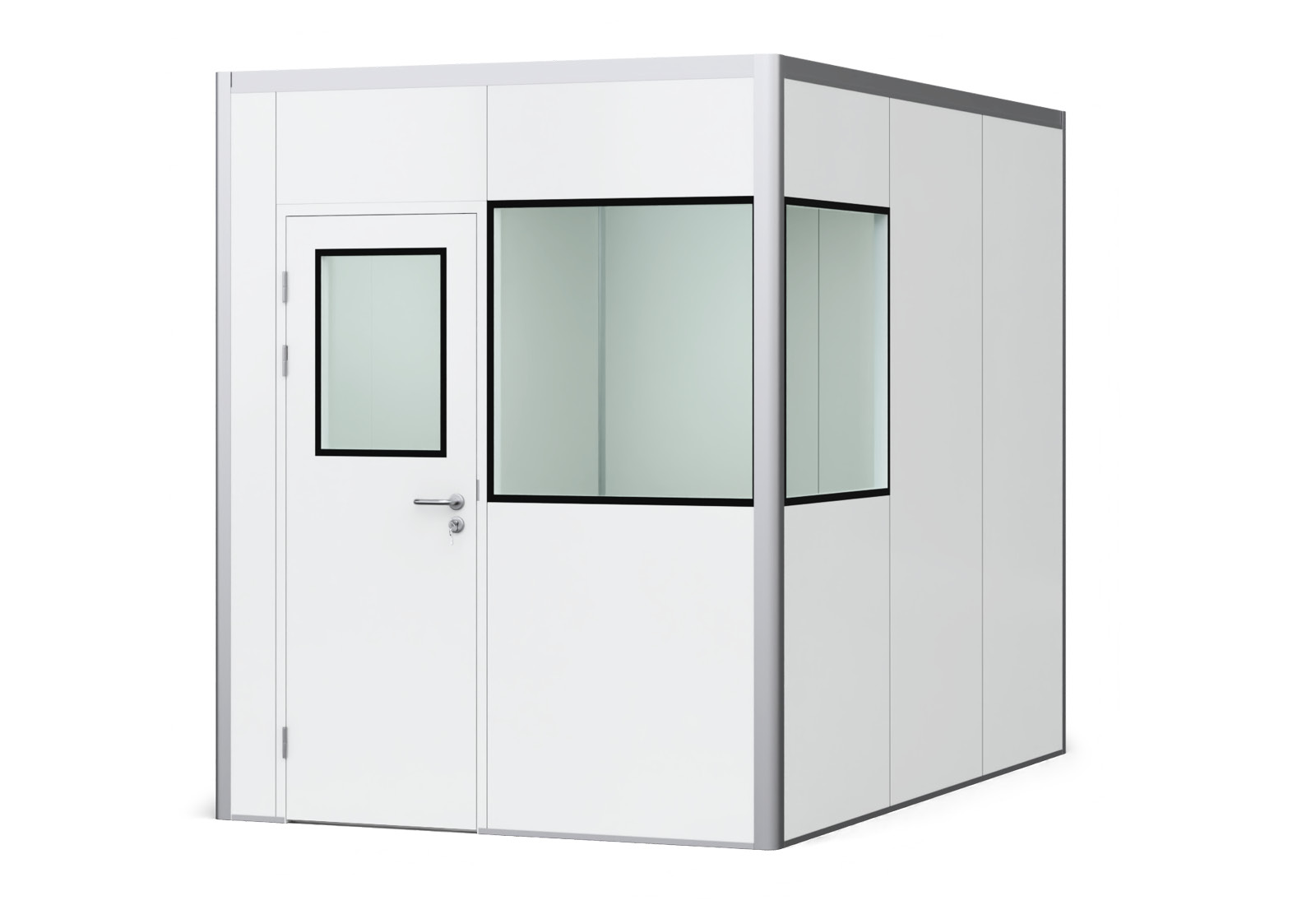 Höjden (2.500 mm inre mått | 2.550 mm yttre mått) och rumsdjupet (3.000 mm inre mått | 3.100 mm yttre mått) förblir alltid desamma. Materialet i panelerna, som är byggda i sandwichkonstruktion, består av stål på utsidan och insidan (vitt, sprutmålat, 0,4 mm stål) och stenull i mitten som ett isolerande lager. Detta innebär att panelerna inte är särskilt lätta (11 kg/m²) men mycket stabila och att lite buller från den ofta bullriga hallmiljön tränger in i rum-i-rum-systemet. Isoleringsvärdet är mellan 20 - 40 dB beroende på ljudnivån utomhus. Värmeisoleringsvärdet för PREFAB-hallens kontor är 0,787 W/(m²K) och värmeledningsförmågan 0,05 W/(mK).