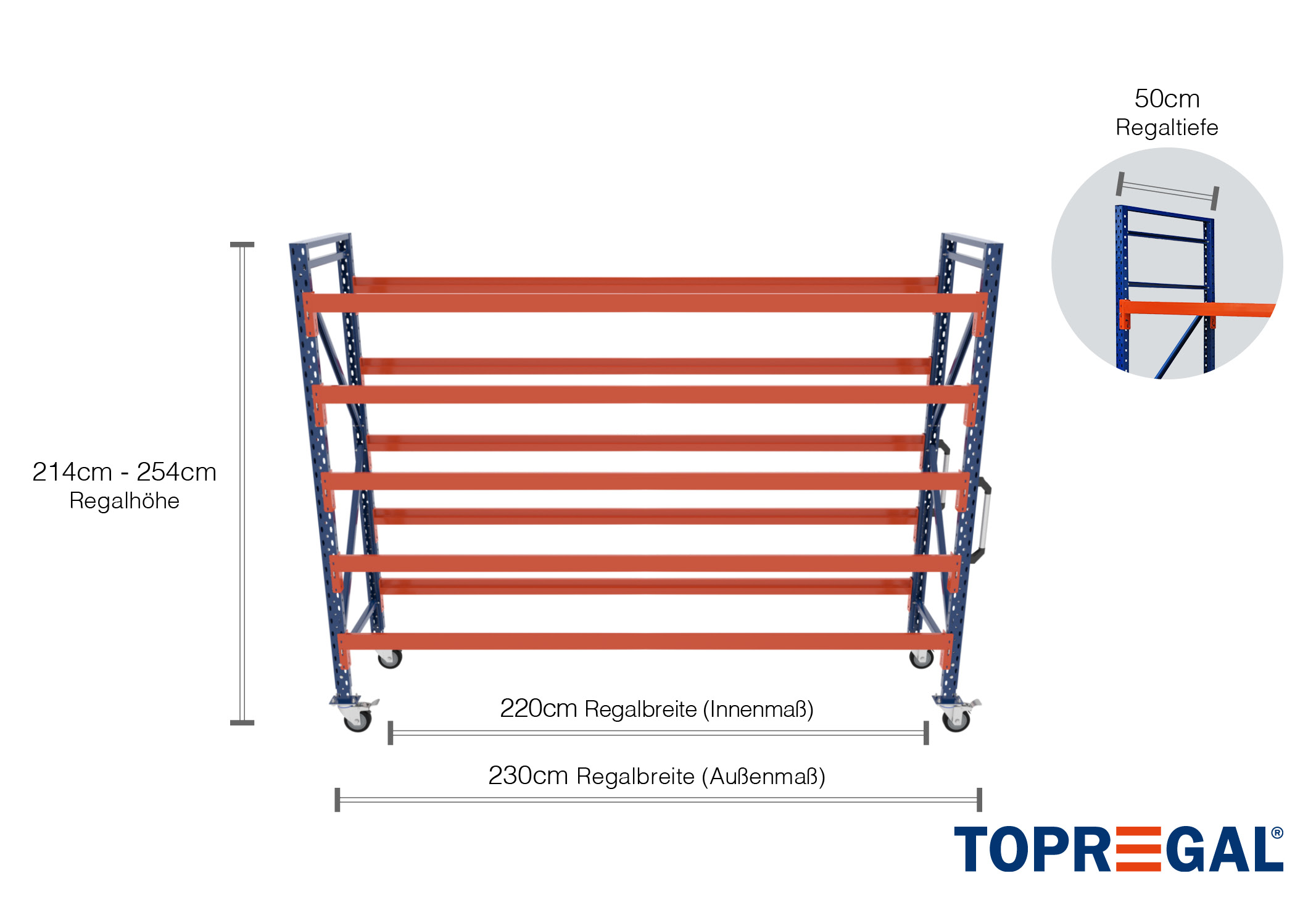 Yttermåttet är 2,3 m. Den användbara stödytan (innermått) är 10 cm smalare och motsvarar vald balklängd. Du kan enkelt förvara dina varor på de 5 nivåerna. Dessa får inte överstiga en maximal belastning på 500 kg per fält och 500 kg per fack. Denna information avser alltid jämnt fördelade laster.