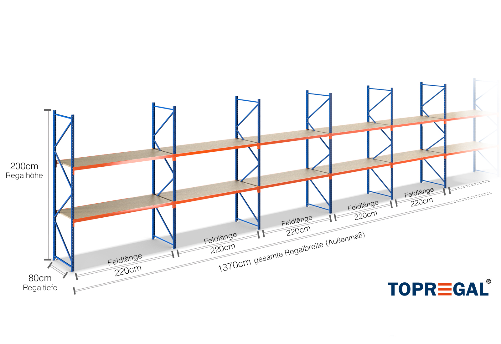 Denna lagerhylla imponerar med sin höjd på 2 m, är 80 cm djup och har en bredd på 13,7 m. De 2 nivåerna ger en maximal belastning på 500 kg vardera, där den maximala belastningen mellan två stativ (fältbelastningen) på 2.000 kg inte får överskridas. Denna information avser alltid en jämn belastning på hyllorna. Tack vare instickssystemet är det enkelt och snabbt att montera. För hyllorna med bred spännvidd på TOPREGAL finns dessutom ett stort urval av enskilda delar och tillbehör, t.ex. hyllstativ, balkar, magnetband och förvaringslådor med öppna sidor.