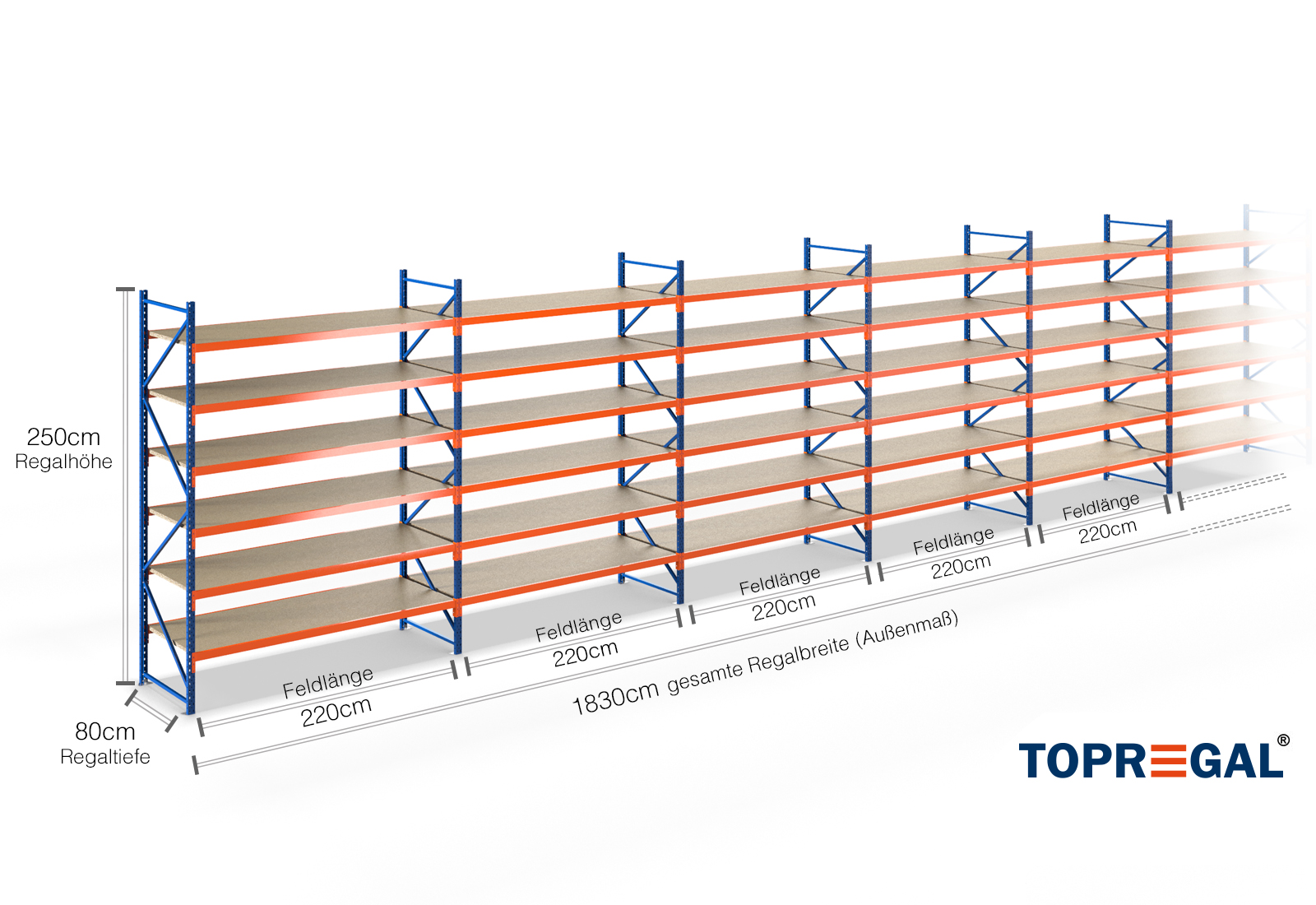 18,3 m lagerhylla LR2000 / 80 cm djup /2,5 m höjd / 6 nivåer / stöd trä