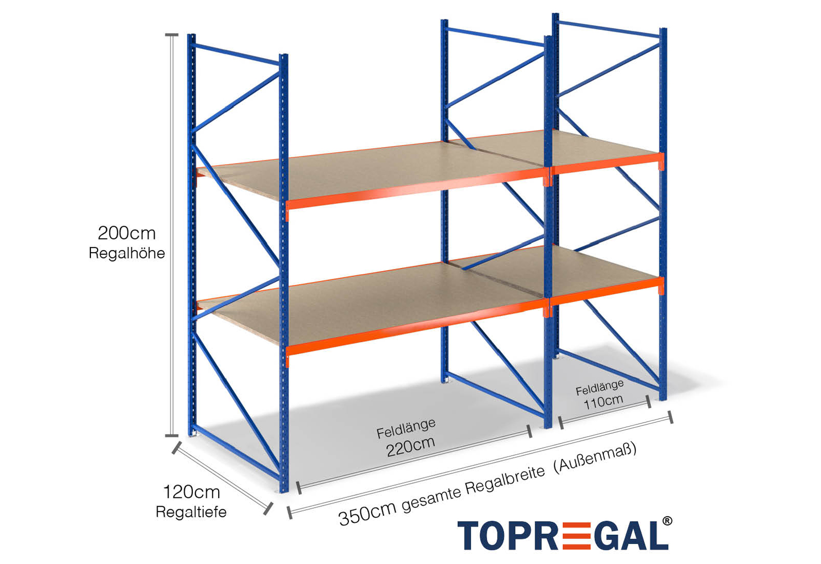 3,5 m lagerhylla LR2000 / 120 cm djup /2 m höjd / 2 nivåer / stöd trä