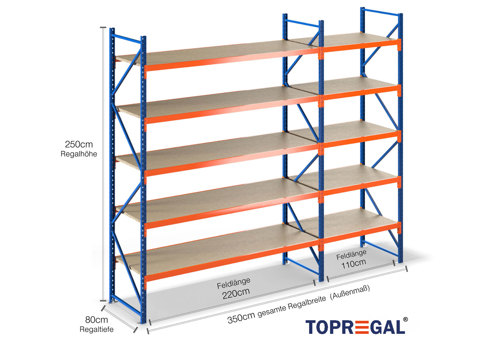 3,5 m lagerhylla LR2000 / 80 cm djup /2,5 m höjd / 5 nivåer / stöd trä