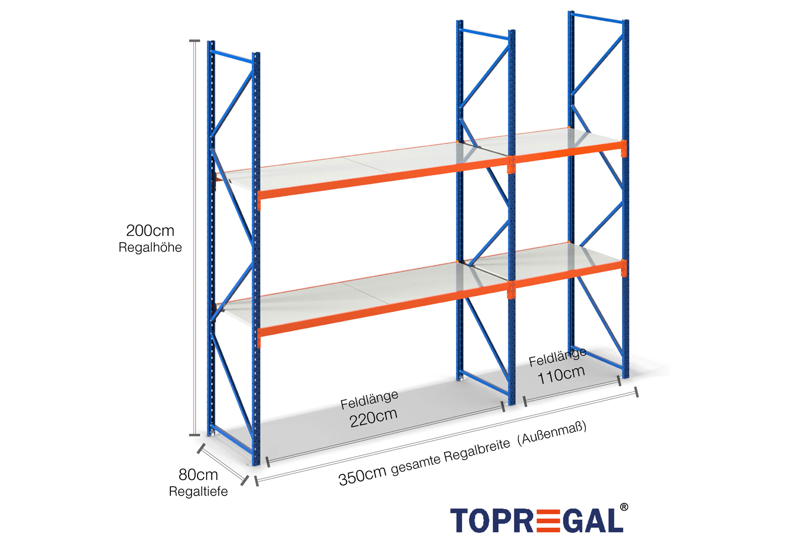 3,5 m lagerhylla LR2000 / 80 cm djup / 2 m höjd / 2 nivåer / stöd stål