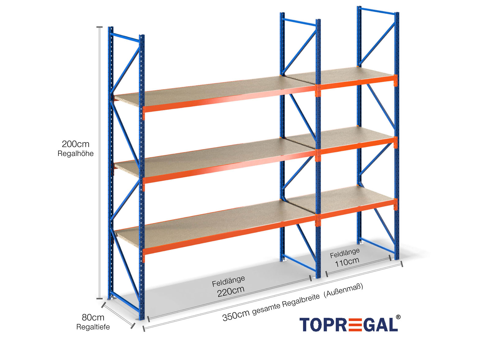 3,5 m lagerhylla LR2000 / 80 cm djup /2 m höjd / 3 nivåer / stöd trä