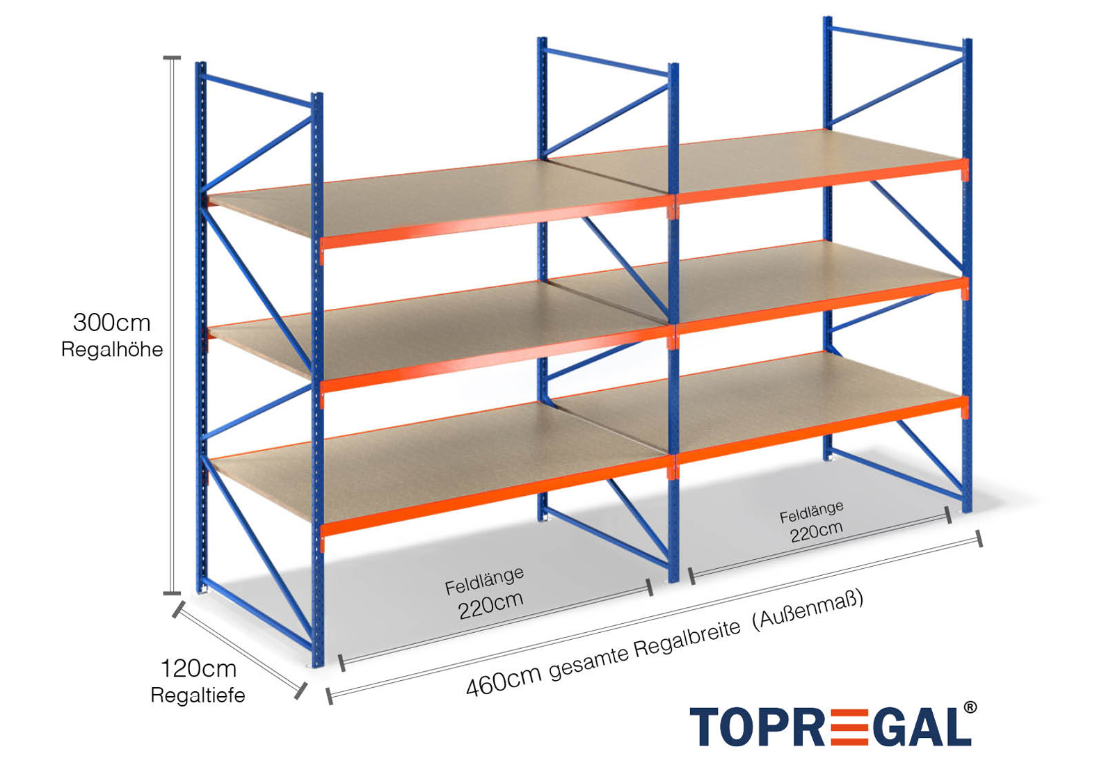 Denna lagerhylla imponerar med sin höjd på 3 m, är 120 cm djup och har en bredd på 4,6 m. De 3 nivåerna ger en maximal belastning på 500 kg vardera, där den maximala belastningen mellan två stativ (fältbelastningen) på 2.000 kg inte får överskridas. Denna information avser alltid en jämn belastning på hyllorna. Tack vare instickssystemet är det enkelt och snabbt att montera. För hyllorna med bred spännvidd på TOPREGAL finns dessutom ett stort urval av enskilda delar och tillbehör, t.ex. hyllstativ, balkar, magnetband och förvaringslådor med öppna sidor.