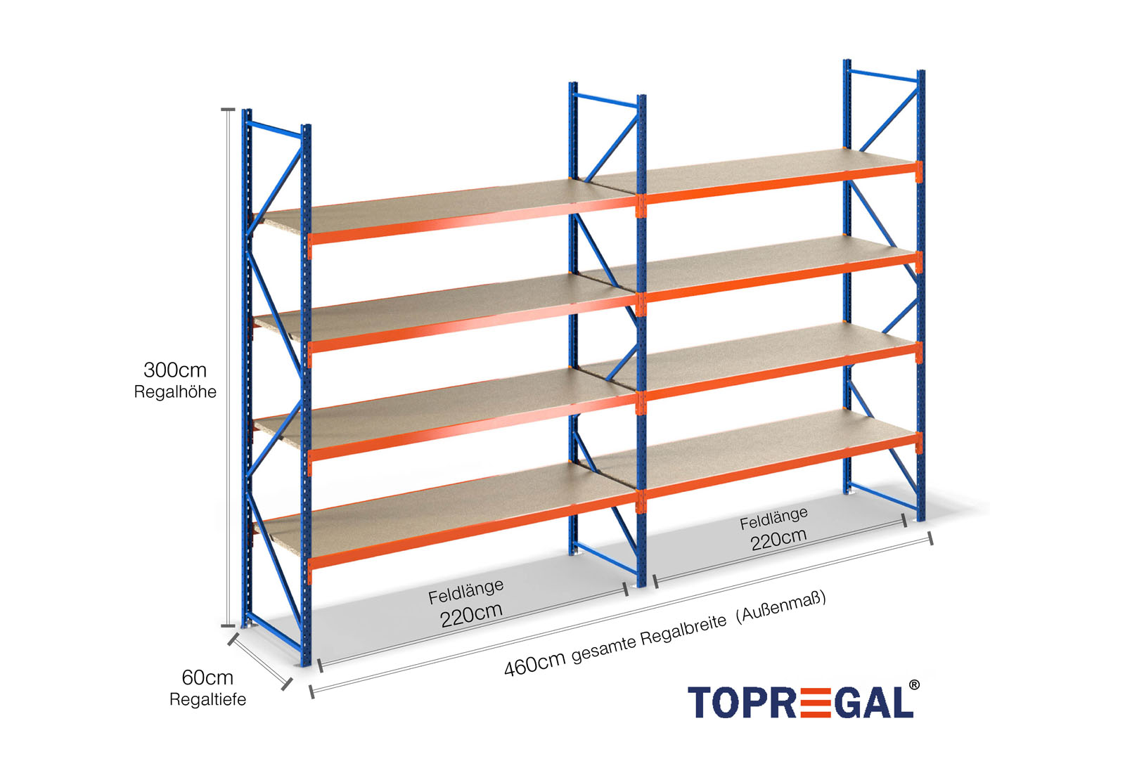 Denna lagerhylla imponerar med sin höjd på 3 m, är 60 cm djup och har en bredd på 4,6 m. De 4 nivåerna ger en maximal belastning på 500 kg vardera, där den maximala belastningen mellan två stativ (fältbelastningen) på 2.000 kg inte får överskridas. Denna information avser alltid en jämn belastning på hyllorna. Tack vare instickssystemet är det enkelt och snabbt att montera. För hyllorna med bred spännvidd på TOPREGAL finns dessutom ett stort urval av enskilda delar och tillbehör, t.ex. hyllstativ, balkar, magnetband och förvaringslådor med öppna sidor.