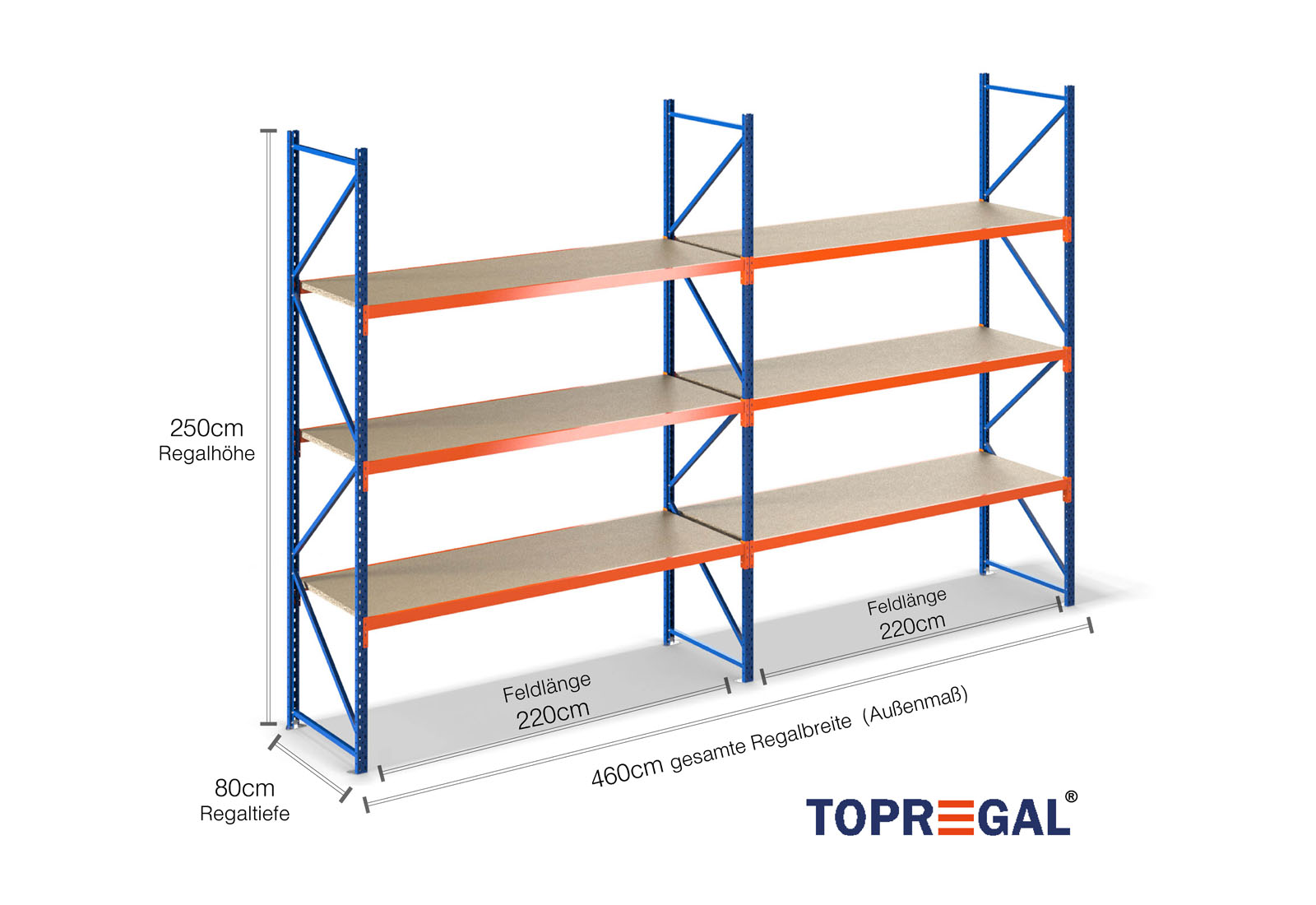 4,6 m lagerhylla LR2000 / 80 cm djup /2,5 m höjd / 3 nivåer / stöd trä