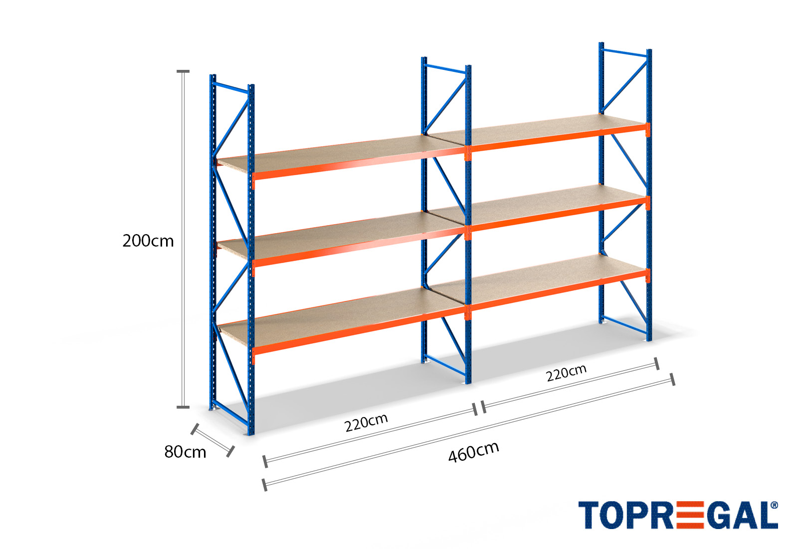 Denna lagerhylla imponerar med sin höjd på 2 m, är 80 cm djup och har en bredd på 4,6 m. De 3 nivåerna ger en maximal belastning på 500 kg vardera, där den maximala belastningen mellan två stativ (fältbelastningen) på 2.000 kg inte får överskridas. Denna information avser alltid en jämn belastning på hyllorna. Tack vare instickssystemet är det enkelt och snabbt att montera. För hyllorna med bred spännvidd på TOPREGAL finns dessutom ett stort urval av enskilda delar och tillbehör, t.ex. hyllstativ, balkar, magnetband och förvaringslådor med öppna sidor.