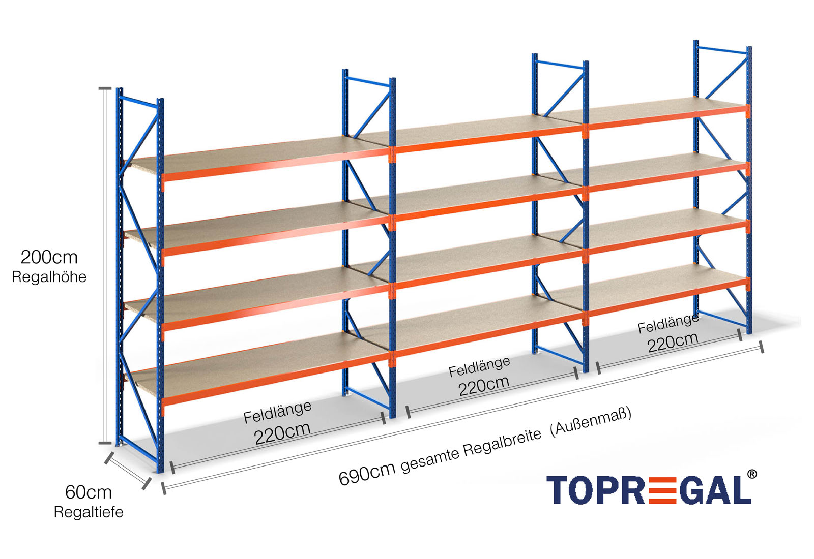 6,9 m lagerhylla LR2000 / 60 cm djup /2 m höjd / 4 nivåer / stöd trä