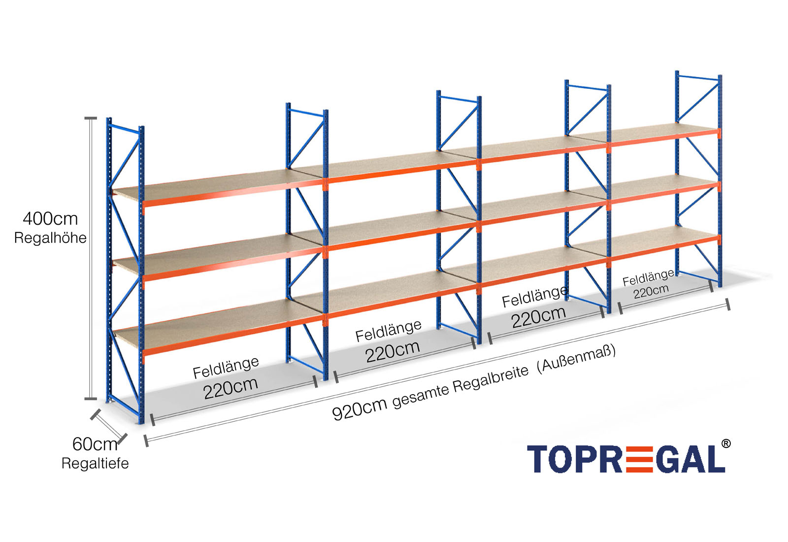 Denna lagerhylla imponerar med sin höjd på 4 m, är 60 cm djup och har en bredd på 9,2 m. De 3 nivåerna ger en maximal belastning på 500 kg vardera, där den maximala belastningen mellan två stativ (fältbelastningen) på 2.000 kg inte får överskridas. Denna information avser alltid en jämn belastning på hyllorna. Tack vare instickssystemet är det enkelt och snabbt att montera. För hyllorna med bred spännvidd på TOPREGAL finns dessutom ett stort urval av enskilda delar och tillbehör, t.ex. hyllstativ, balkar, magnetband och förvaringslådor med öppna sidor.