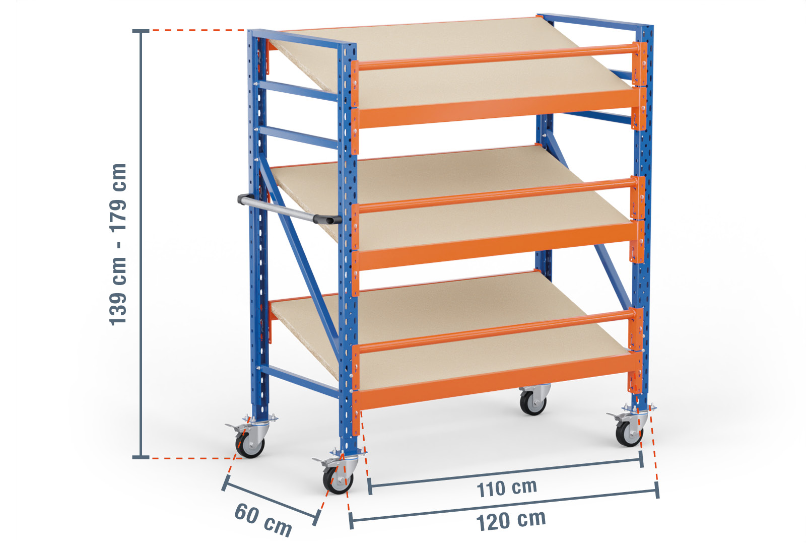 Denna mobila hylla med snedställda hyllgolv från TOPREGAL består av 3 nivåer som var och en är utrustad med ett snedställt hyllgolv av trä. En nivå har även två stegbalkar som är själva lastbärarna och en rund balk som används som fallskydd. Balkarna är orangelackerade och kan hakas i individuellt i ett rutnät på 50 mm. Detta förbättrar ergonomin på din hylla och gör att du kan konfigurera dina fack med optimal storlek.