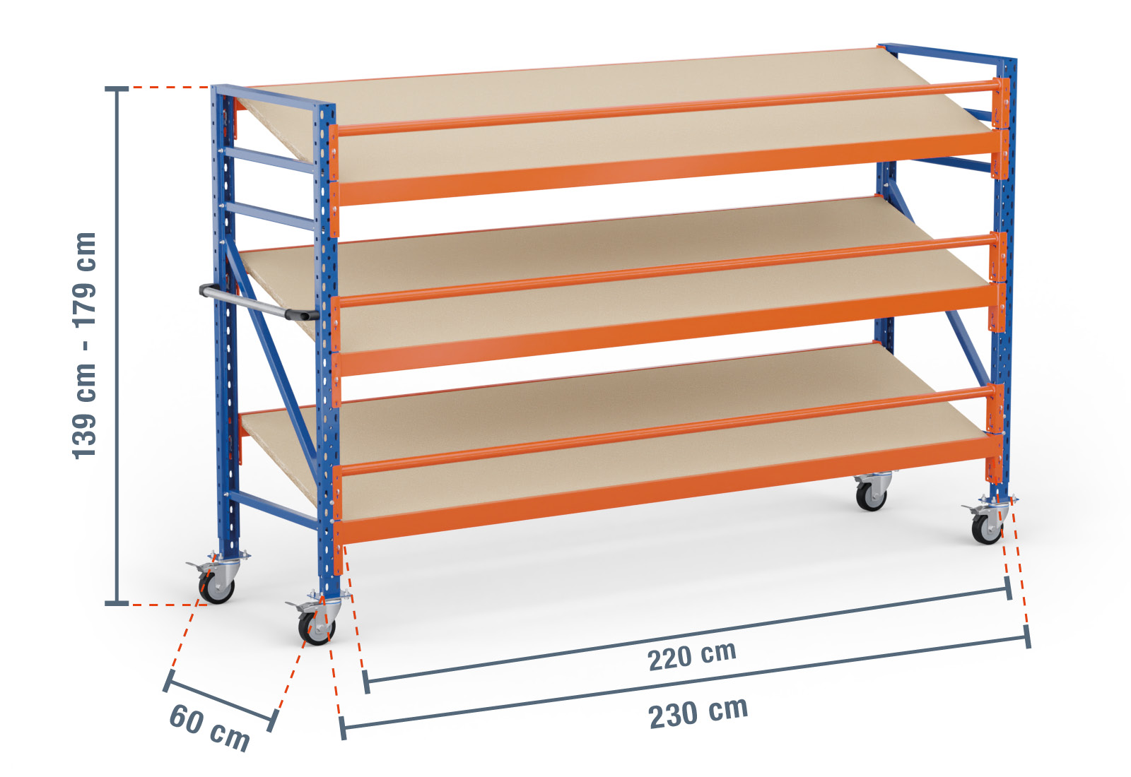 Yttermåtten på denna mobila hylla med snedställda hyllgolv är 2,3 m, där den användningsbara stödytan, det så kallade innermåttet, är 10 cm kortare. Den maximala lastkapaciteten för ett hyllfack är 300 kg och fältbelastningen (maximal belastning mellan två hyllstativ vid jämn viktfördelning) är 500 kg.