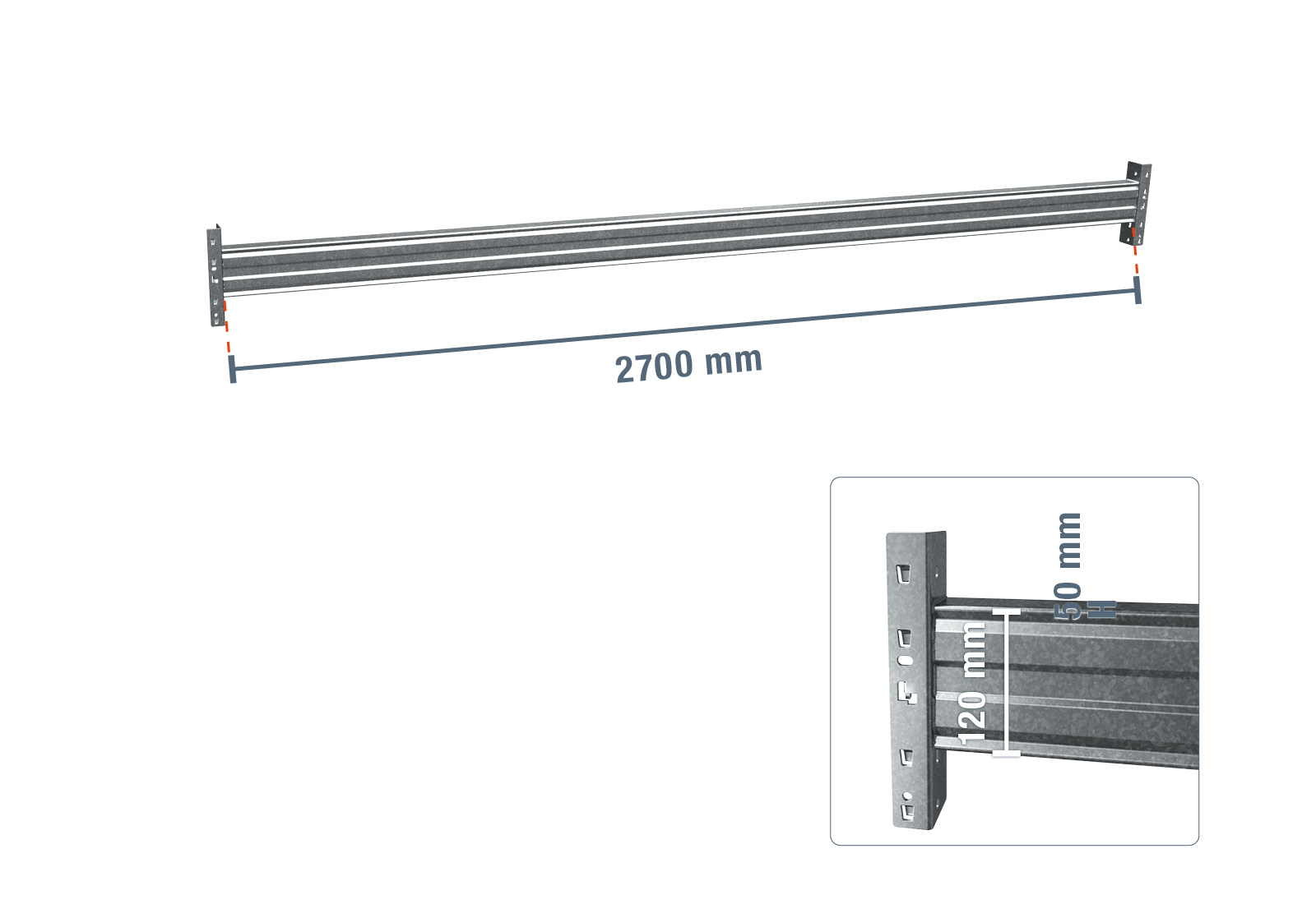 - 1 x 270 cm enkelbalk varmförzinkad för pallhylla PR9000F / fackbelastning 3.000 kg