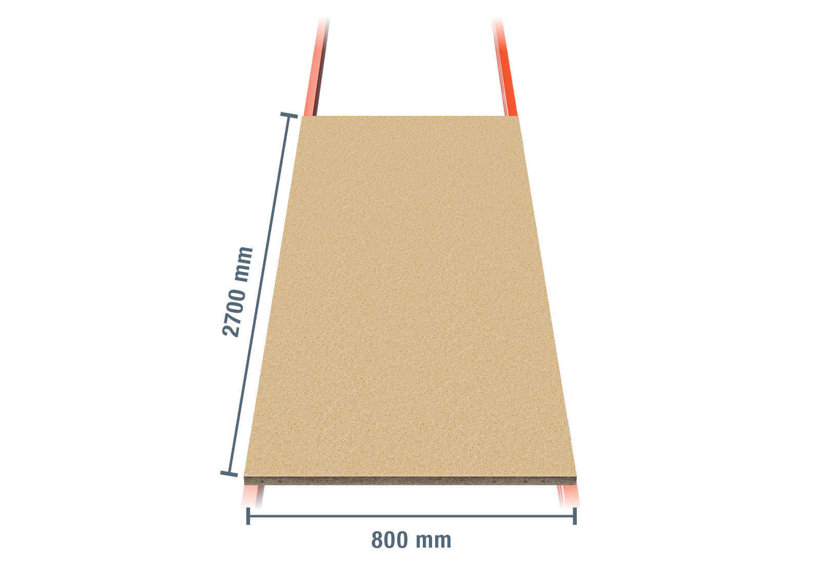 Med den här pallhyllan med trägolv kan du snabbt och enkelt lägga till extra avställningsyta till din TOPREGAL-pallhylla, så att en förvaring utan pall är möjlig. Det kostnadseffektiva trästödet är en 38 mm tjock spånskiva, med måtten 2.700 mm x 800 mm, vilken placeras på pallhyllebalkarna med hjälp av 4 Z-vinklar.