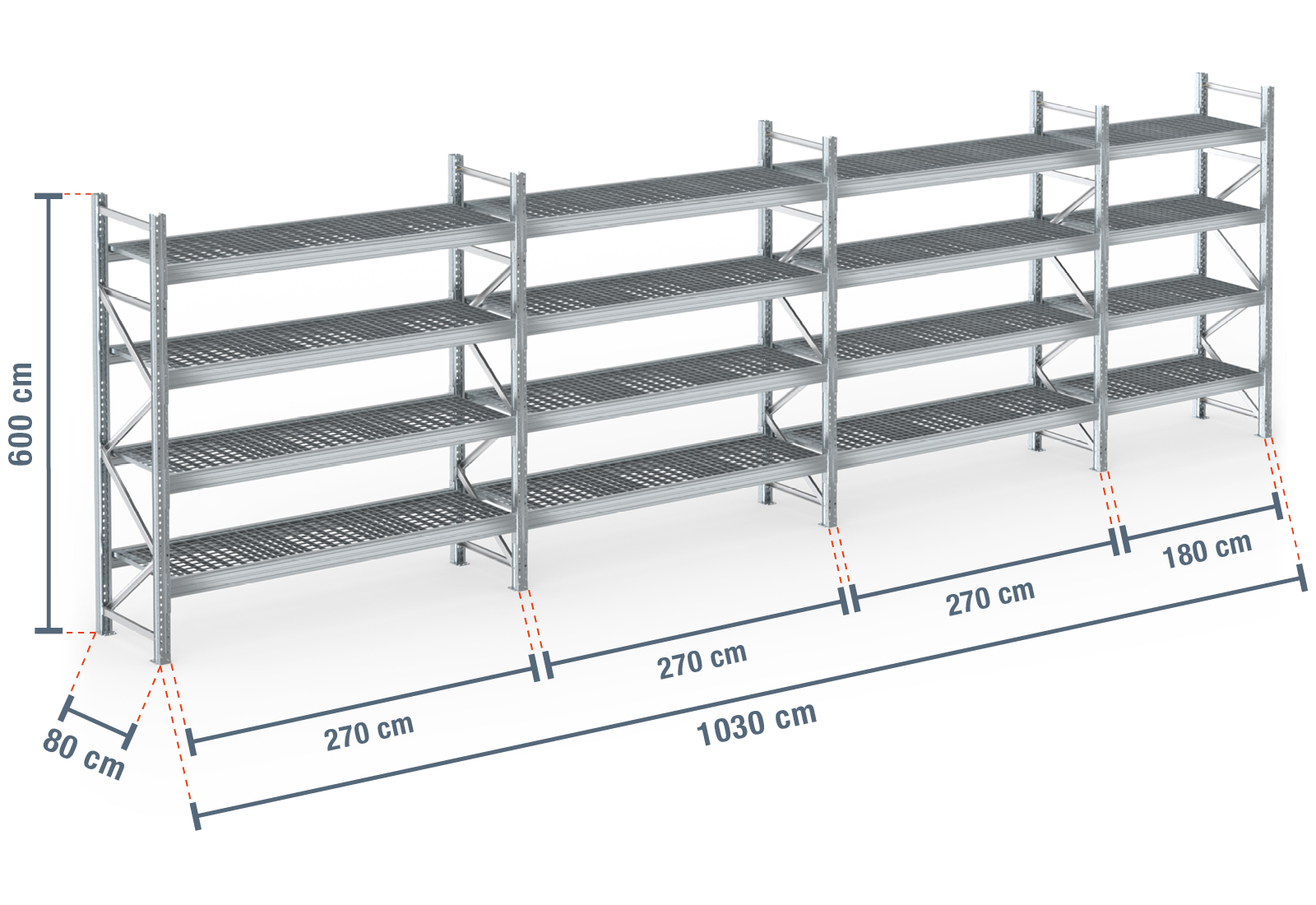 10,3 m pallhylla PR9000F varmförzinkad / 80 cm djup / 6 m höjd / 4 nivåer / stöd galler