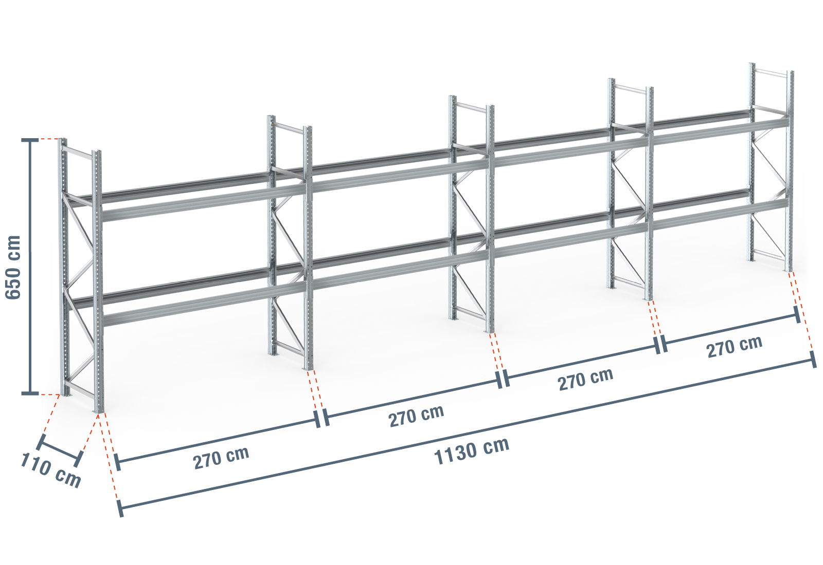 11,3 m pallhylla PR9000F varmförzinkad / 110 cm djup / 6,5 m höjd / 2 nivåer för 36 europapallar