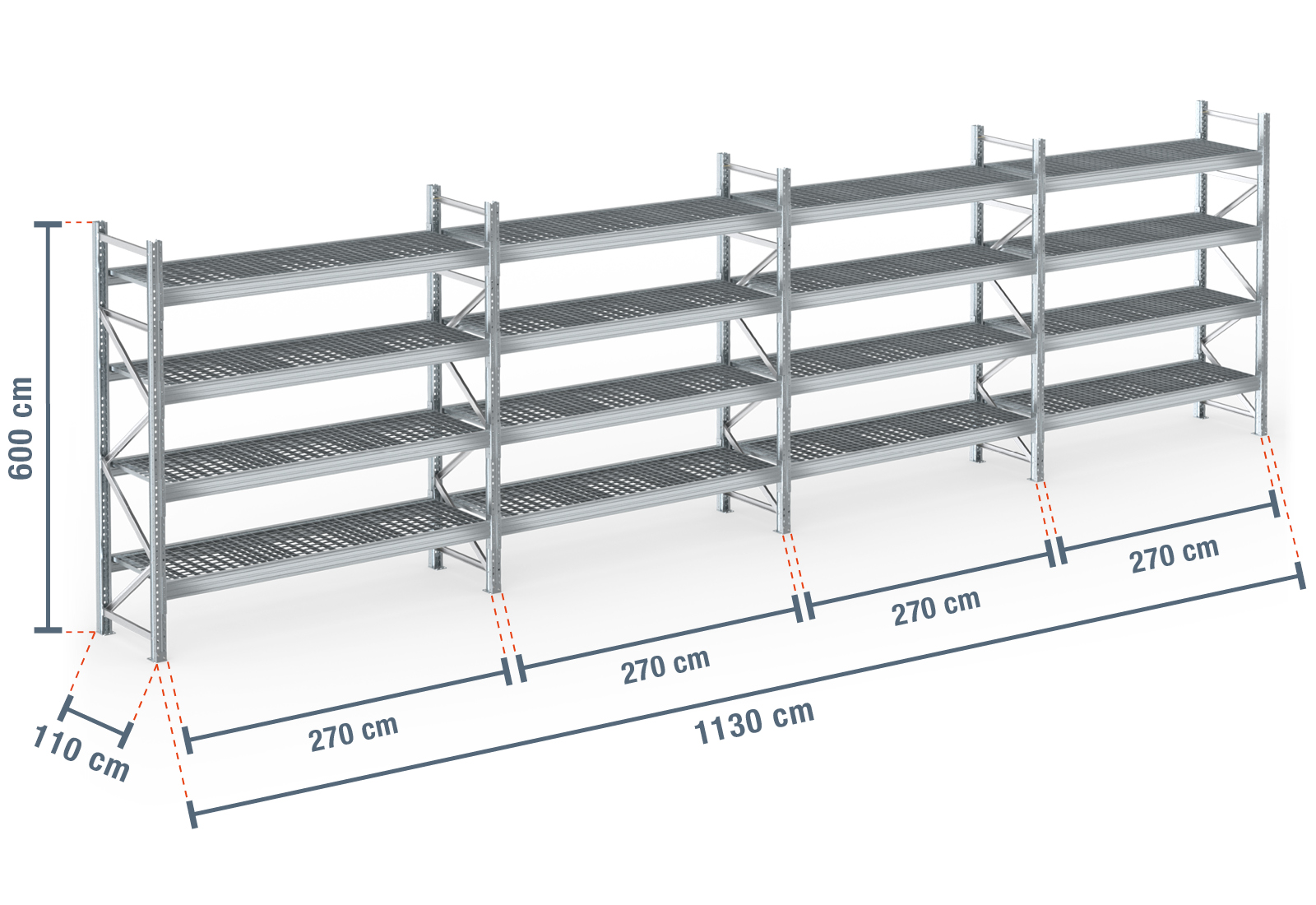 11,3 m pallhylla PR9000F varmförzinkad / 110 cm djup / 6 m höjd / 4 nivåer / stöd galler