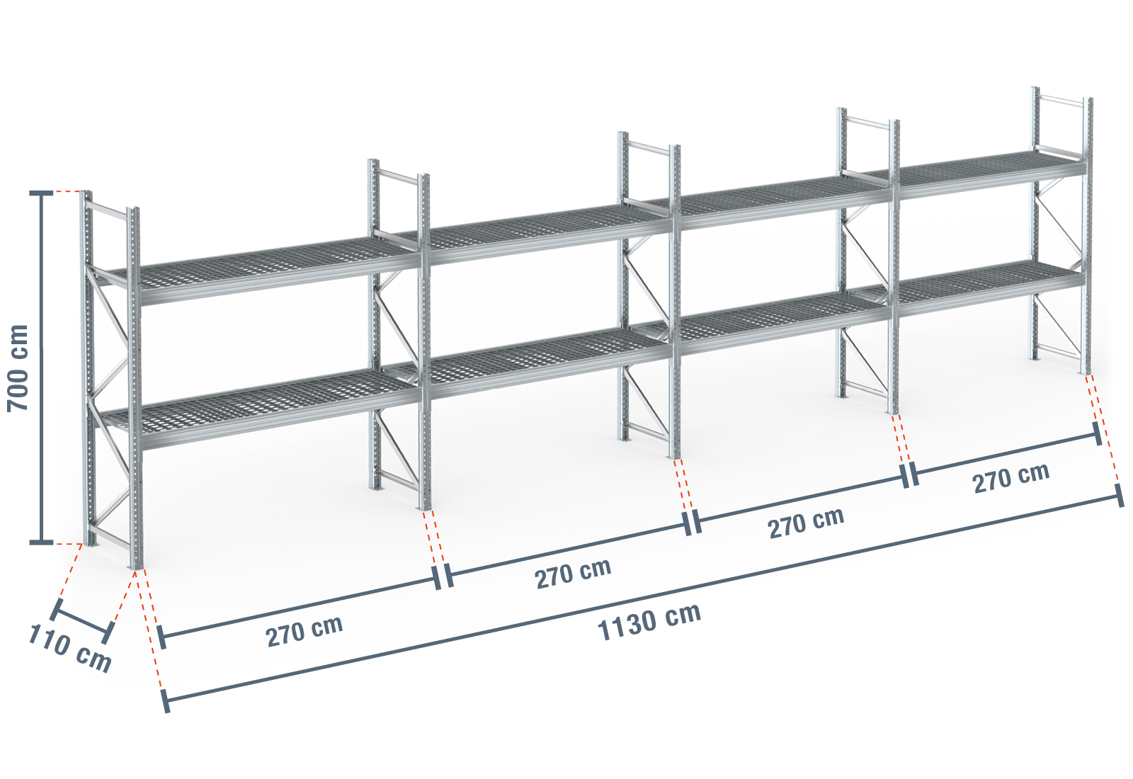11,3 m pallhylla PR9000F varmförzinkad / 110 cm djup / 7 m höjd / 2 nivåer / stöd galler