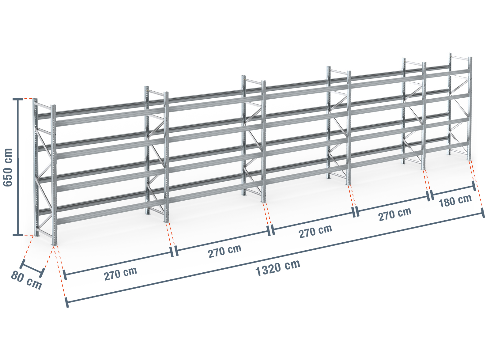 13,2 m pallhylla PR9000F varmförzinkad / 80 cm djup / 6,5 m höjd / 4 nivåer för 70 europapallar