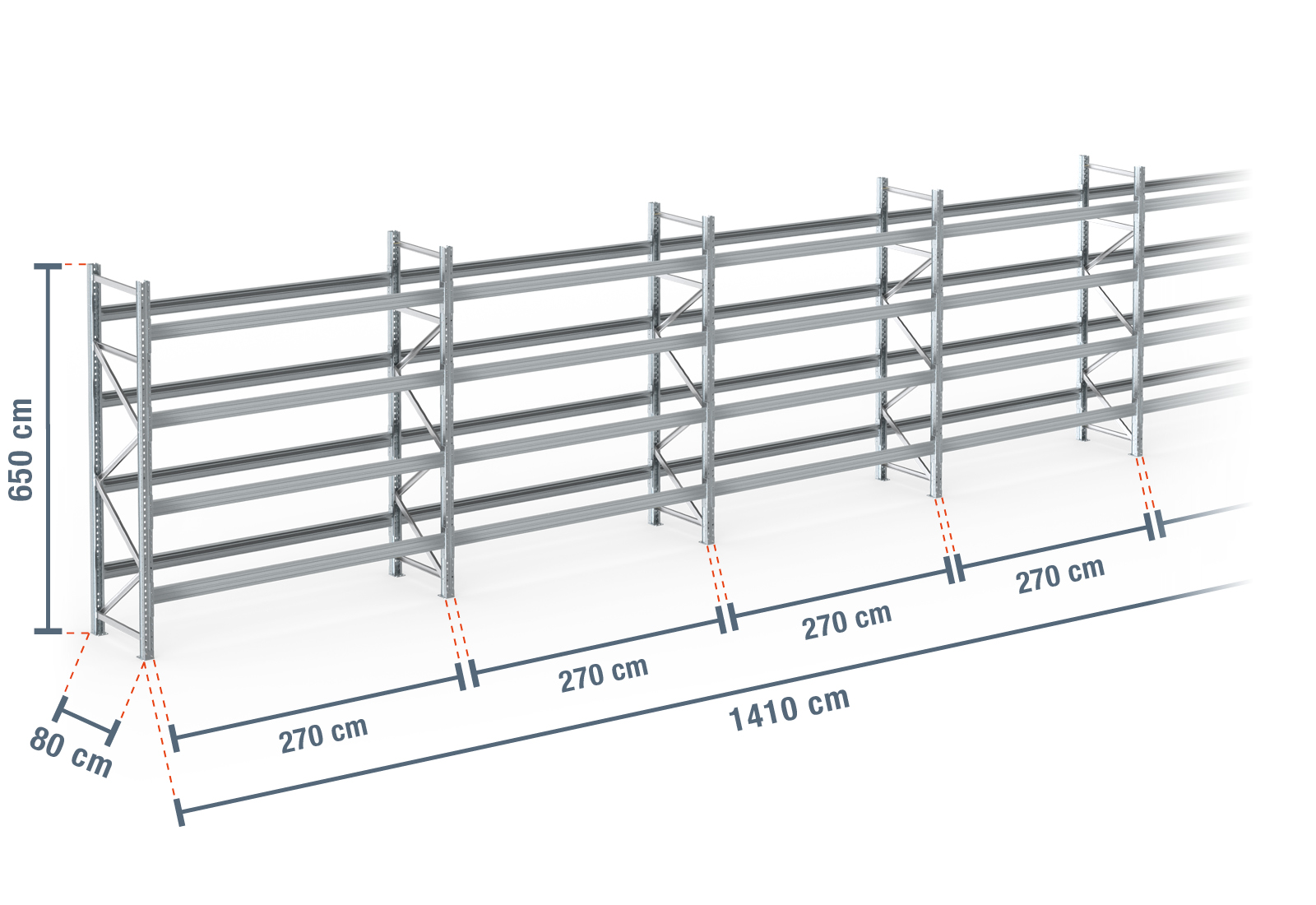 14,1 m pallhylla PR9000F varmförzinkad / 80 cm djup / 6,5 m höjd / 4 nivåer för 75 europapallar