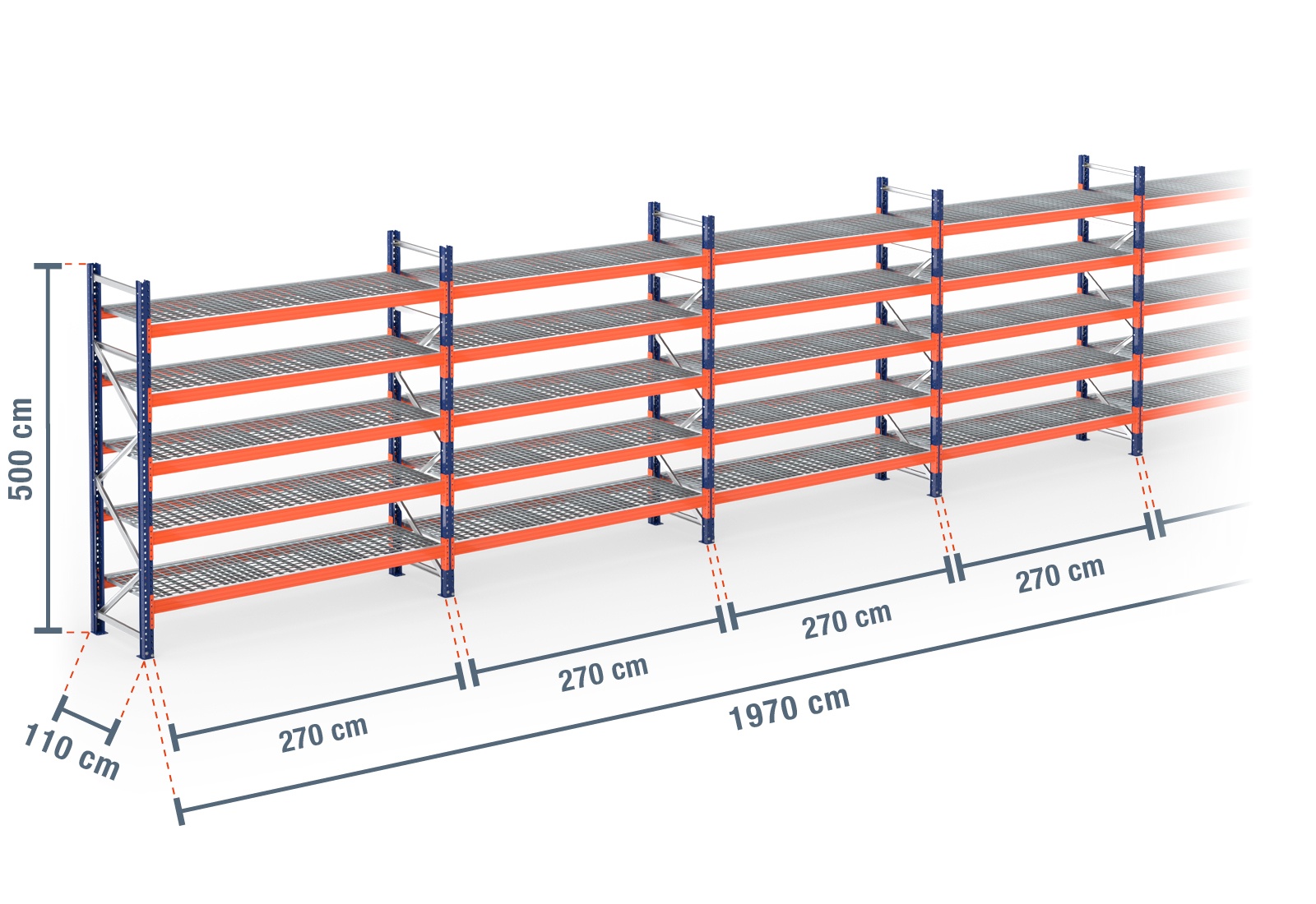 19,7 m pallhylla PR9000 / 110 cm djup / 5 m höjd / 5 nivåer / stöd galler