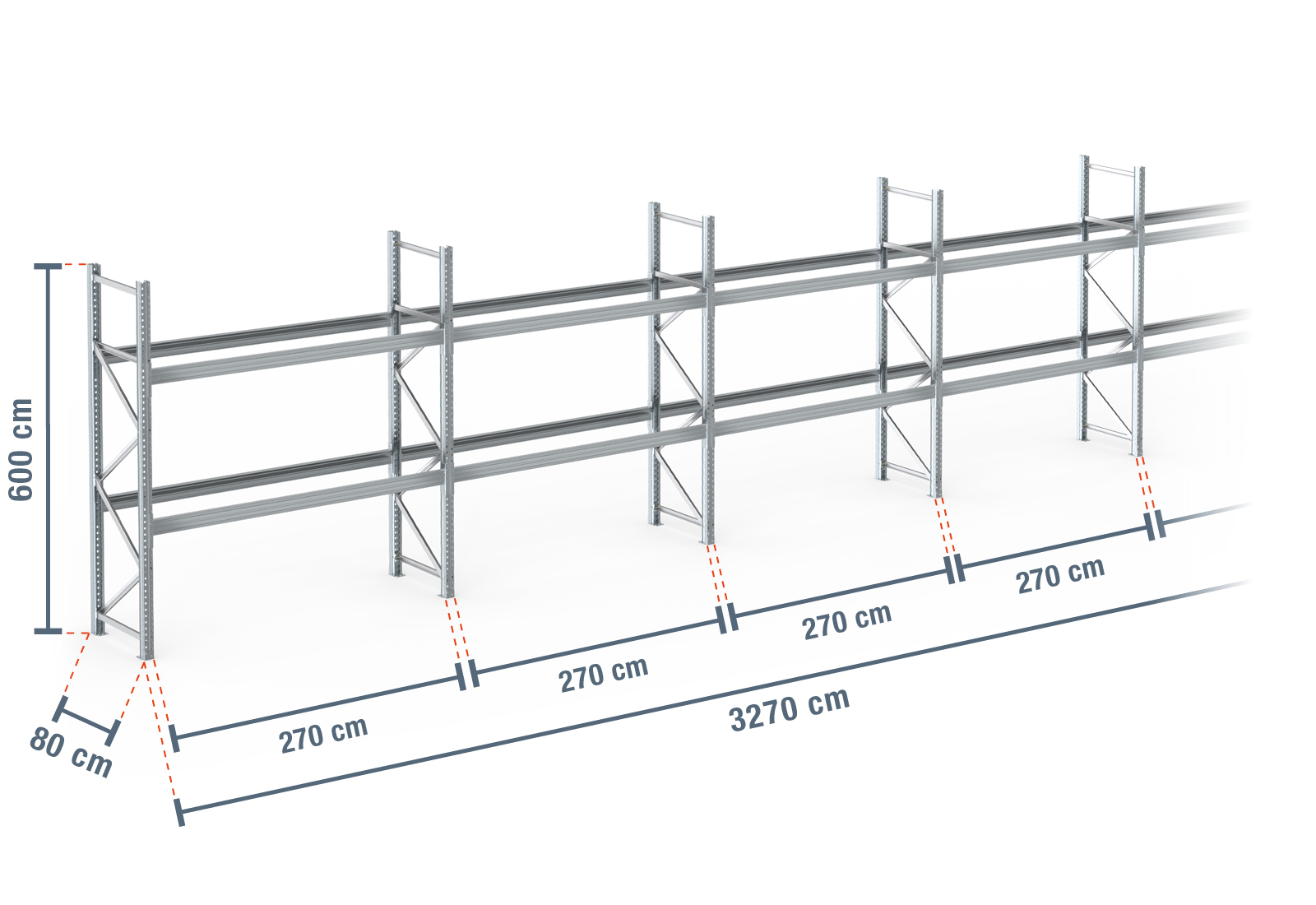 32,7 m pallhylla PR9000F varmförzinkad / 80 cm djup / 6 m höjd / 2 nivåer för 105 europapallar