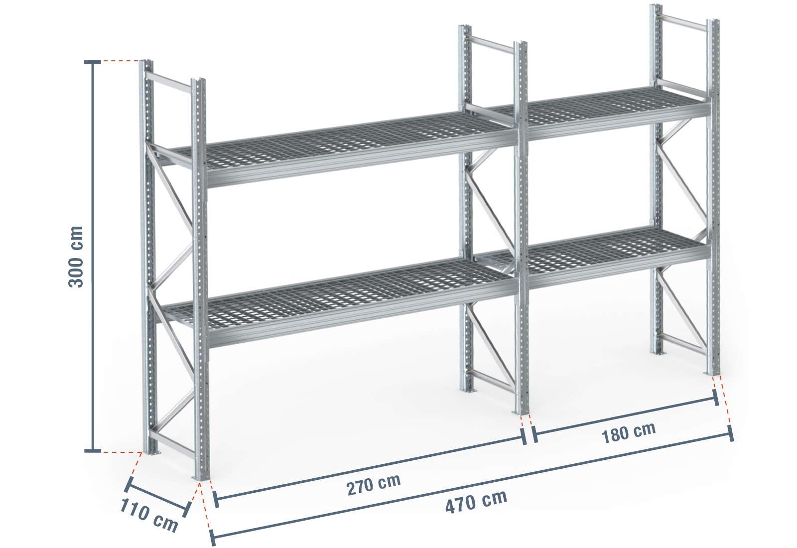 4,7 m pallhylla PR9000F varmförzinkad / 110 cm djup / 3 m höjd / 2 nivåer / stöd galler
