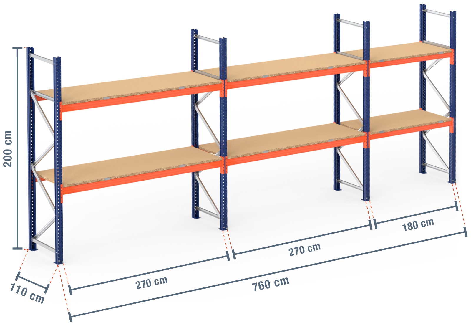 7,6 m pallhylla PR9000 / 110 cm djup / 2 m höjd / 2 nivåer / stöd trä