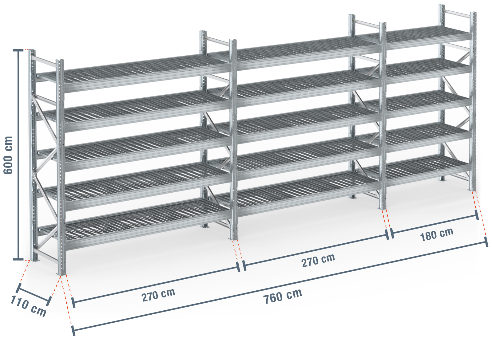 7,6 m pallhylla PR9000F varmförzinkad / 110 cm djup / 6 m höjd / 5 nivåer / stöd galler